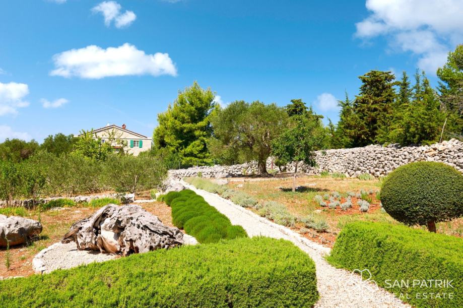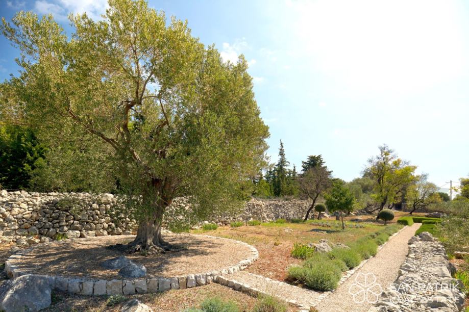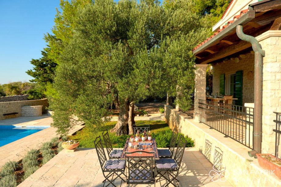 U središtu dvorišta nalazi se grijani bazen od 75 m2 sa sunčalištem okruženim stoljetnima maslinama i borovima. Dvije masline stare preko 800 godina čine ovu parcelu živim spomenikom prirode. Ovdje vrijeme usporava, a dan završava u tišini uz čašu vina i zalazak sunca koji puca preko horizonta.