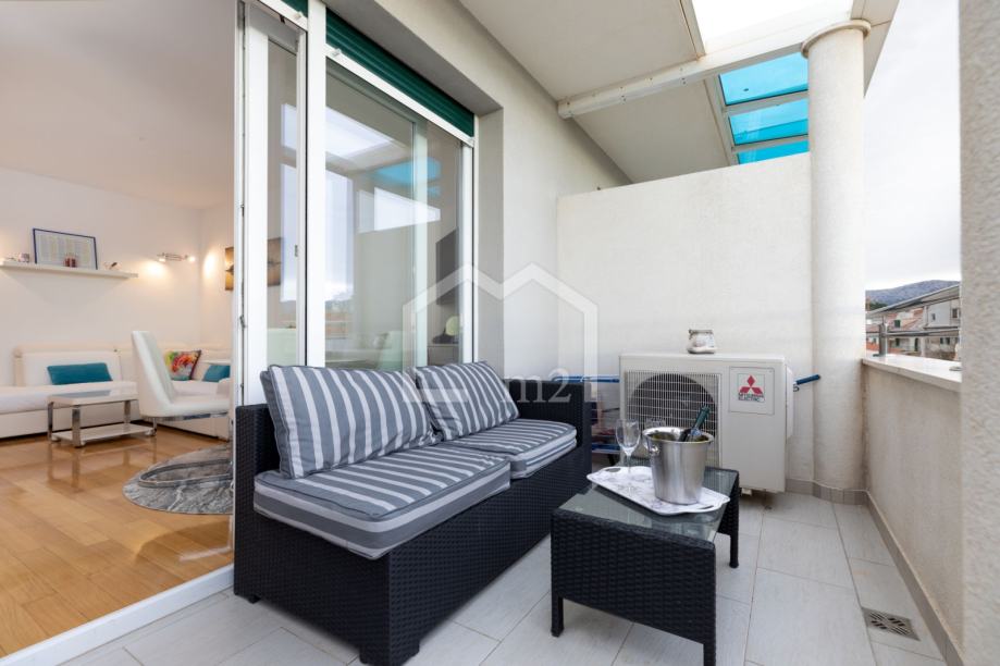 Stan se sastoji od ulaznog dijela, dnevnog boravka, blagovaonice, kuhinje, dvije spavaće sobe, kupaone i velike terase koja ima izuzetan pogled na more i plažu.
