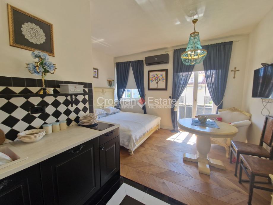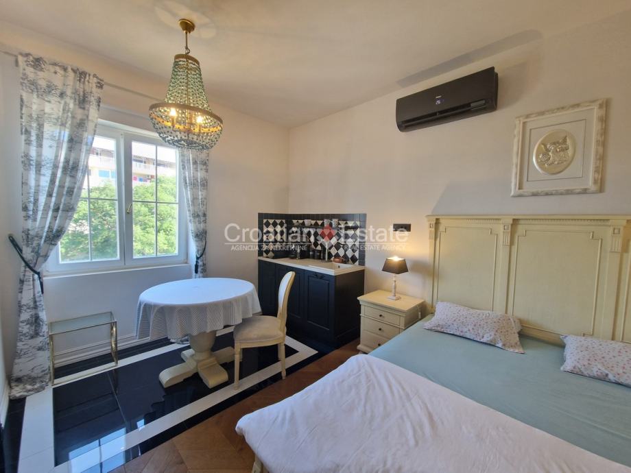(u naravi tri studio apartmana s kuhinjom i kupatilom), zajedničkog kupatila, ostave i balkona. Vlasnik stana ima suvlasništvo nad 50 m2 potkrovlja gdje postoji potencijal za izradu krovne lođe uz suglasnost nadležnih tijela, mogućnost izgradnje još jednog jednosobnog stana, ili povezivanje unutarnjim stepenicama u dvoetažnu prostoriju. U potkrovlju je sprovedena električna energija, voda i kanalizacija.