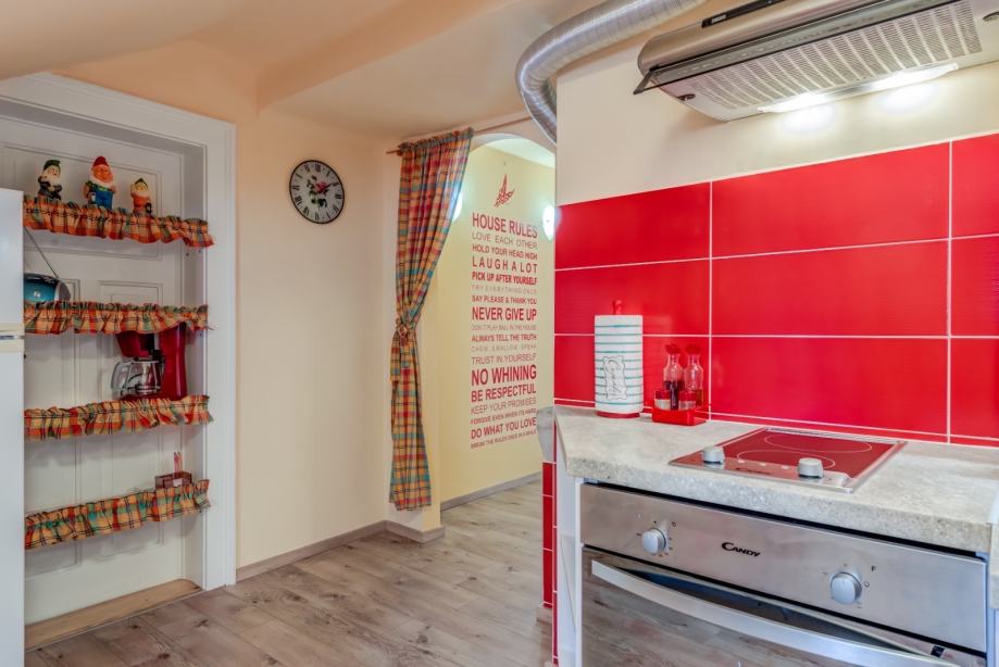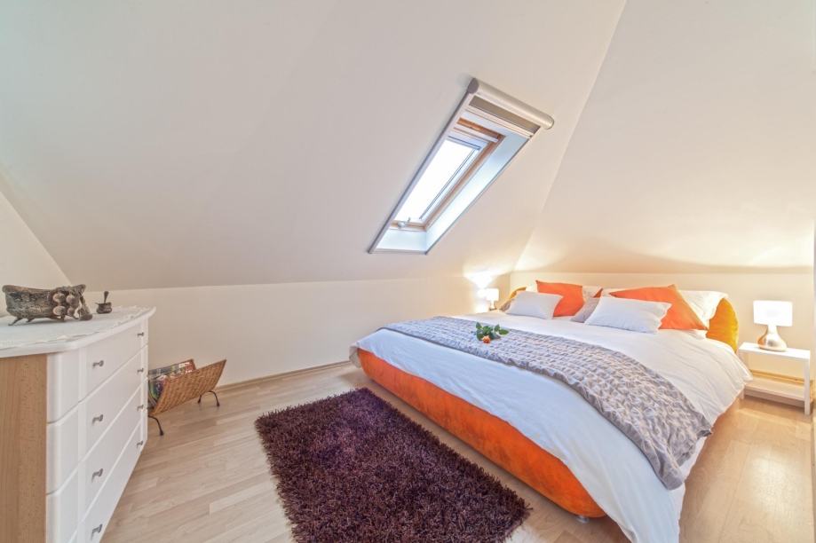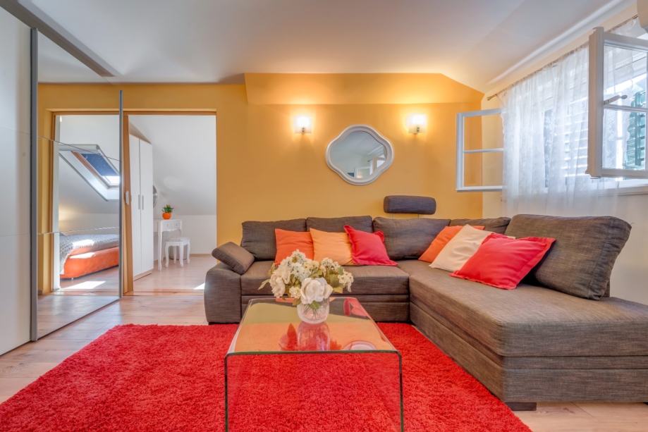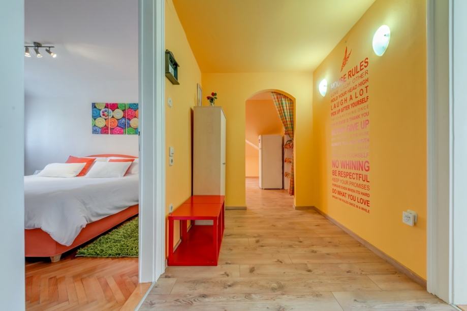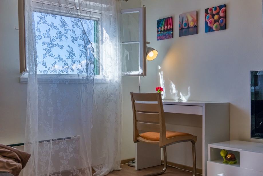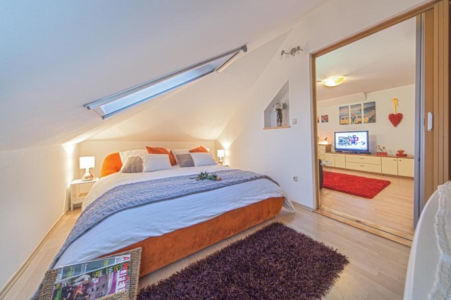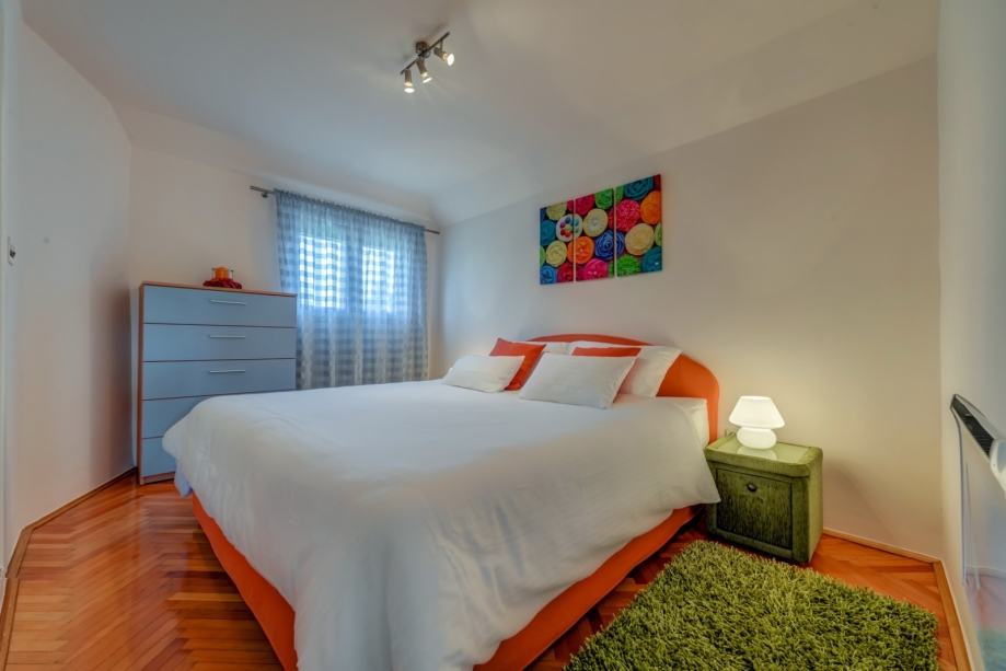 Stan se nalazi na 2. katu kuće, ima 70 m2, a sastoji se od dvije spavaće sobe, kuhinje s blagovaonom, dnevnog boravka i kupaonice.