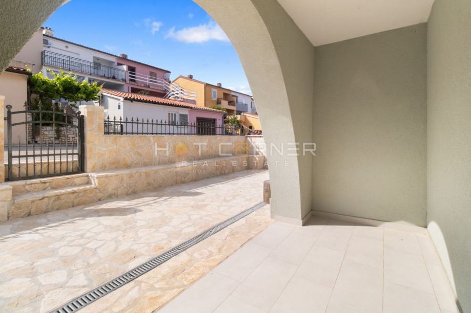 Kuća se sastoji od ulaznog hodnika koji vodi u prostrano prizemlje s velikim dnevnim boravkom od drva, suvremenom kuhinjom, WC-om za goste te velikom terasom za uživanje u toplim danima ili trenucima „Dolce far niente” u sjeni stabala prekrasno uređenog vrta.