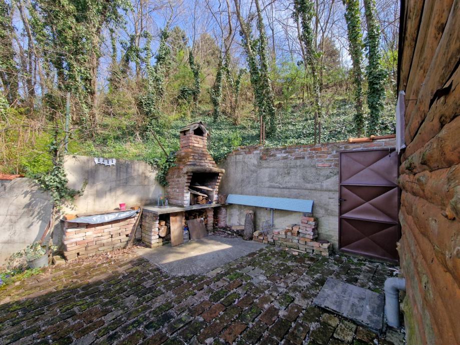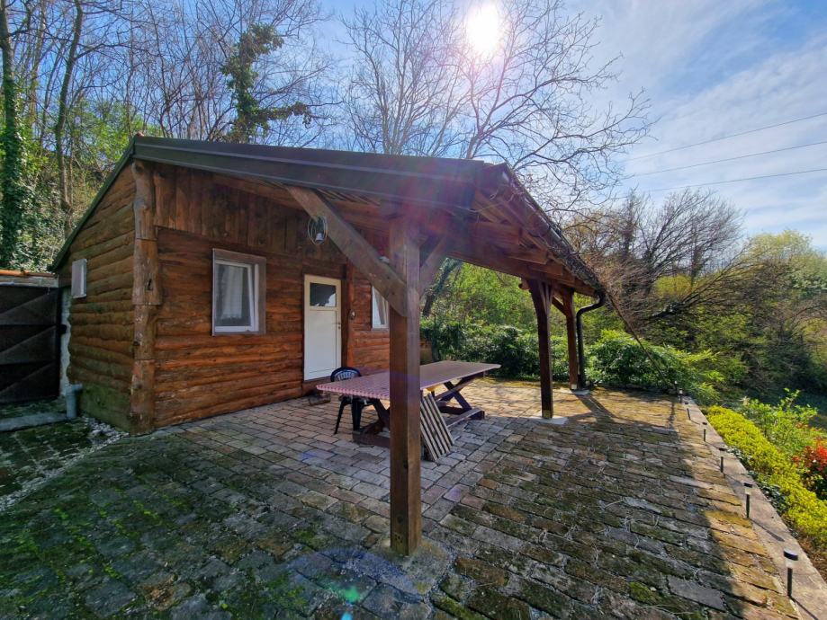 Ispred se nalazi velika natkrivena terasa (cca 6 m x 4 m) s ciglenim podom, a bočno je zidani roštilj.