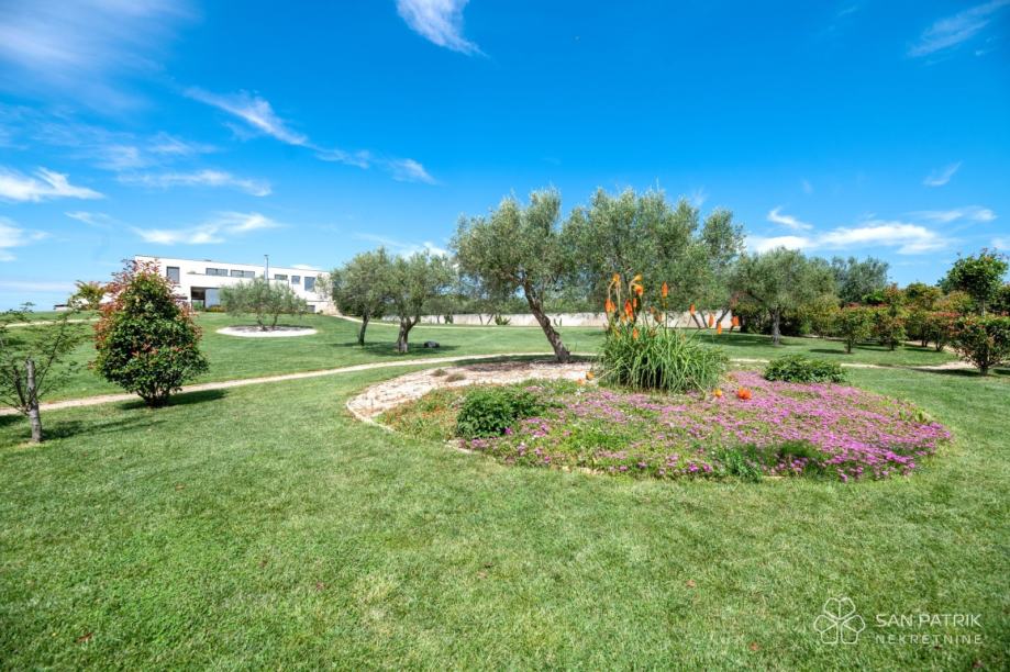 Posjed također uključuje grijani bazen površine 45 m² sa slapom i prostorom za sunčanje. Prostrano dvorište, kao i vila, osmišljeno je s posebnom pažnjom i pruža potpunu privatnost. Drveće, ruže, hortenzije i druge brojne biljke, u kombinaciji sa starim maslinama koje okružuju vilu, automatski se navodnjavaju iz cisterne.