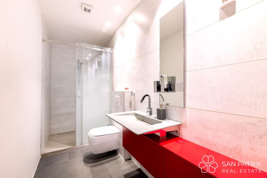 U podrumu se nalazi prostrana garaža, prostor za skladištenje, kino dvorana i toalet. Prizemlje se sastoji od ulaznog hodnika, udobnog dnevnog boravka s blagovaonicom i kuhinjom u otvorenom konceptu koji vodi do natkrivene terase, spavaće sobe s vlastitom kupaonicom i toaletom. Prvi kat ima tri spavaće sobe s vlastitim kupaonicama i terasom dizajniranom kao krovni vrt, koji nudi čarobne poglede na more i zalaske sunca.