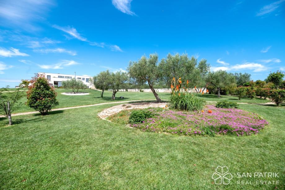 Posjed također uključuje grijani bazen površine 45 m² sa slapom i prostorom za sunčanje. Prostrano dvorište, kao i vila, osmišljeno je s posebnom pažnjom i pruža potpunu privatnost. Drveće, ruže, hortenzije i druge brojne biljke, u kombinaciji sa starim maslinama koje okružuju vilu, automatski se navodnjavaju iz cisterne.