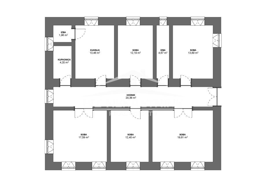Stan se sastoji od ulaznog hodnika, pet soba, kuhinje, izbe, kupaonice i spremišta.