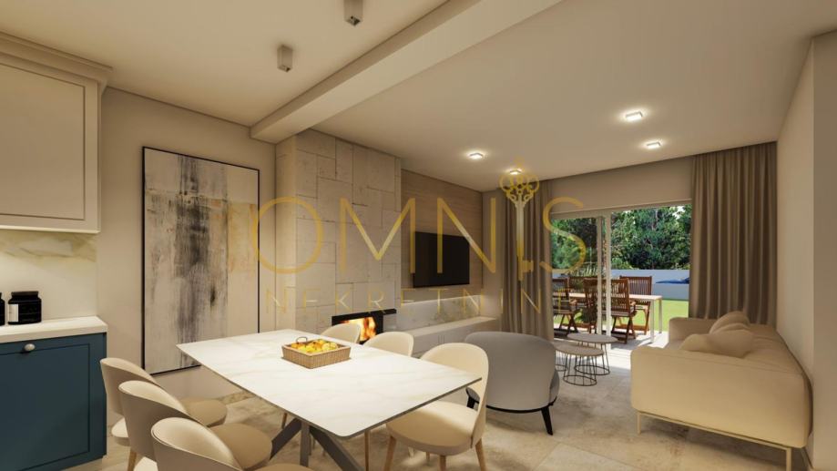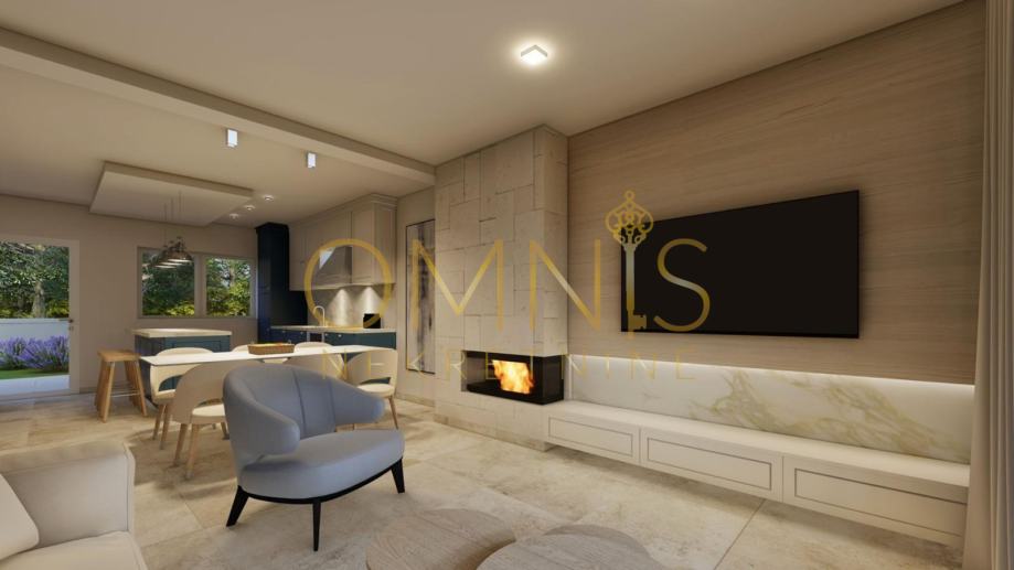 U prizemlju se nalazi prostrani dnevni boravak s velikim staklenim stijenkama koje unose obilje prirodnog svjetla, zajedno s kuhinjom, blagovaonicom, ostavom, toaletom i ulaznim hodnikom. Kuhinja ima izlaz na okućnicu, koja pruža hladovinu i savršeno je mjesto za obiteljska okupljanja. Prvi kat obuhvaća spavaću sobu s vlastitom kupaonicom i balkonom, dvije manje sobe te dodatnu kupaonicu s vešerajem.