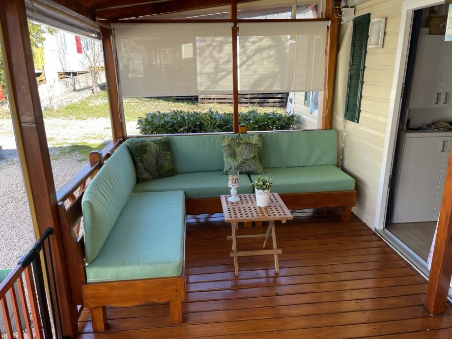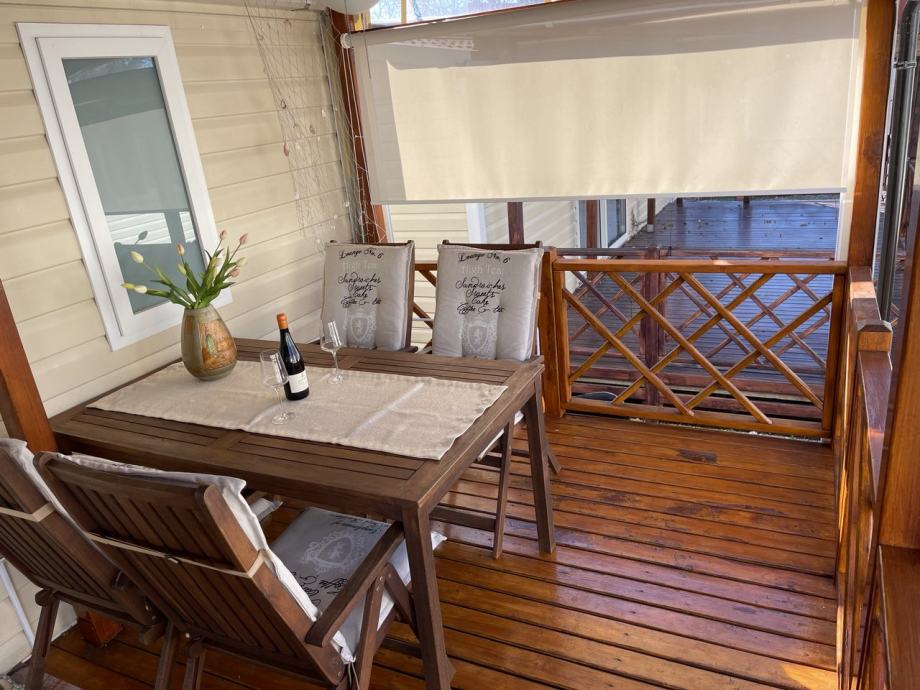 Terasa ima udobnu garnituru za sjedenje, stol,stolice,ležaljke,screen platno za zasjenjivanje i privatnost.