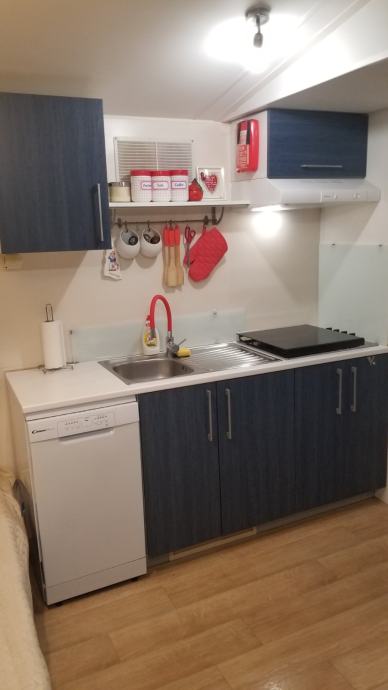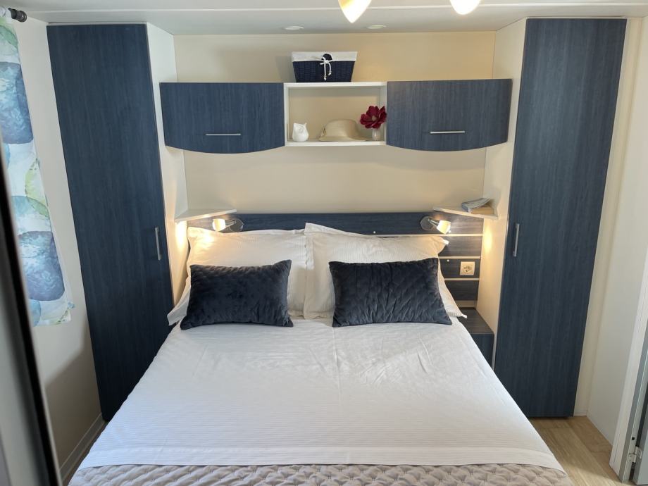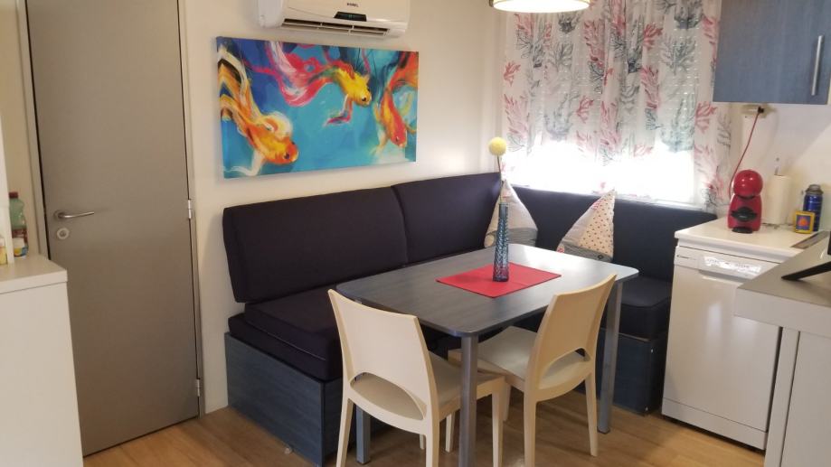 Mobilna kućica je kompletno opremljena do najmanjeg detalja:perilica posuđa i odjeće,2 hladnjaka s ledenicom, pllinska ploča s 4 gorionika, tv, toster, pećnica,roštilj,coffe aparat, prijenosna indukcija...posuđe,sve do posljednjeg detalja čak i vadi čep za boce:)))