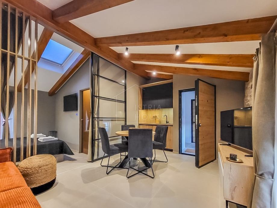 Ovaj moderno obnovljeni stan od 30m², smješten na trećem katu zgrade, odiše šarmom i udobnošću. Prostor je inteligentno organiziran, s naglaskom na otvoreni koncept dnevnog boravka i blagovaonice, što stanu daje prostranost unatoč kompaktnim dimenzijama. Zidovi su zadržali tradicionalni stil kamenim detaljima, što prostoru daje autentičan mediteranski šarm.
