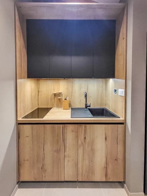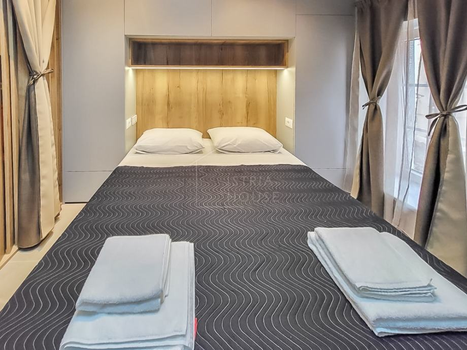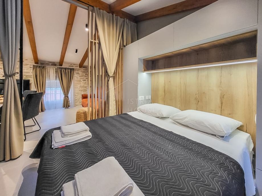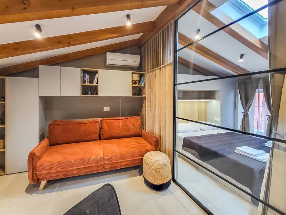 Središnji dio stana čini prostrana spavaća soba odvojena zavjesama, stvarajući intimnost i miran kutak za odmor. Krevet je okružen drvenim elementima i diskretnim rasvjetnim tijelima, stvarajući opuštajuću atmosferu. Dnevni boravak je suvremeno opremljen i povezan s kuhinjom, koja je kompaktna, ali potpuno funkcionalna, savršena za pripremu obroka.