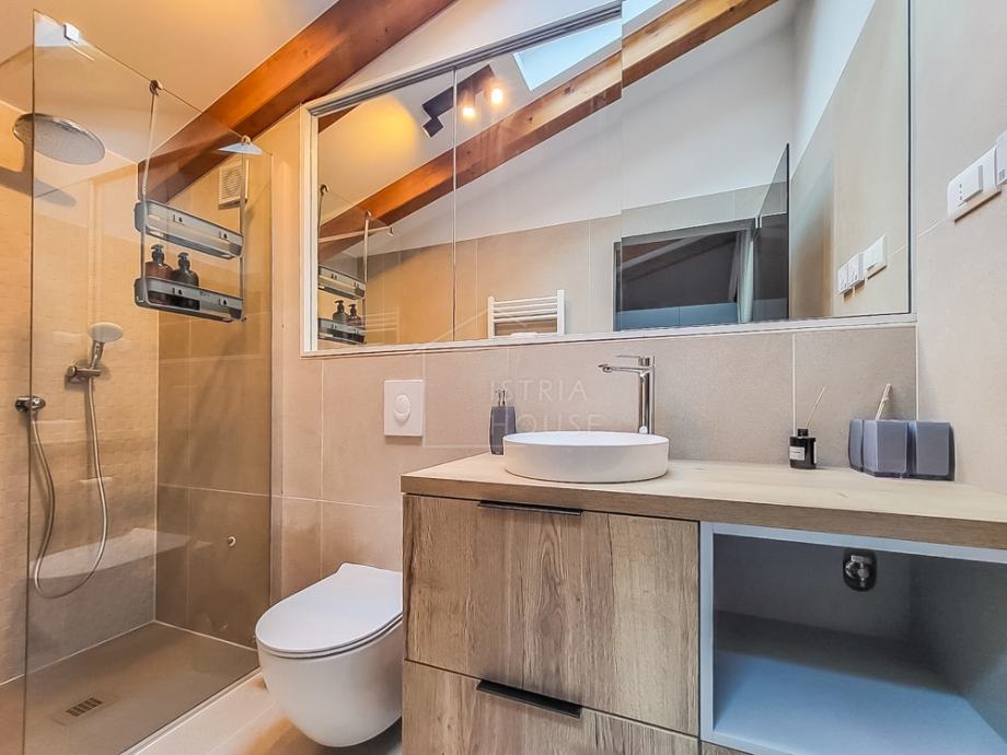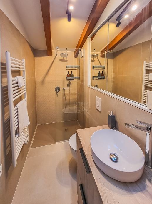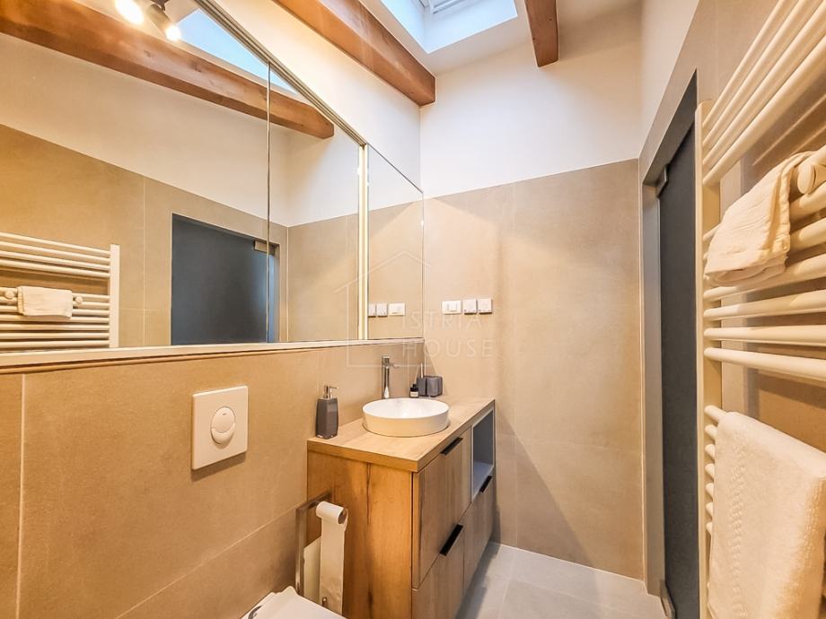 Kupaonica je moderna i elegantna, s čistim linijama i pažljivo biranim detaljima, što dodatno doprinosi luksuznom osjećaju prostora. Veliki prozori i staklene stijene omogućavaju puno prirodnog svjetla, dok krovni prozori unose dodatnu toplinu u prostor.