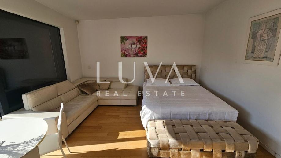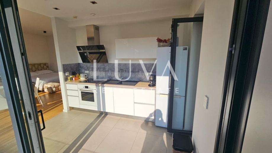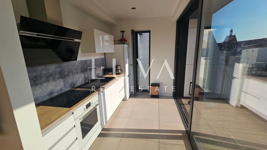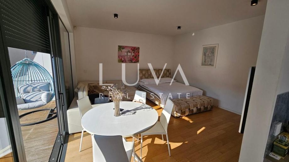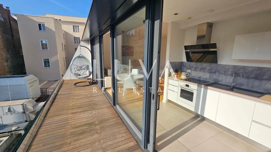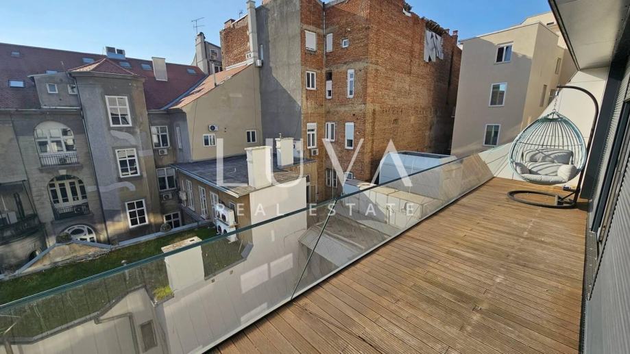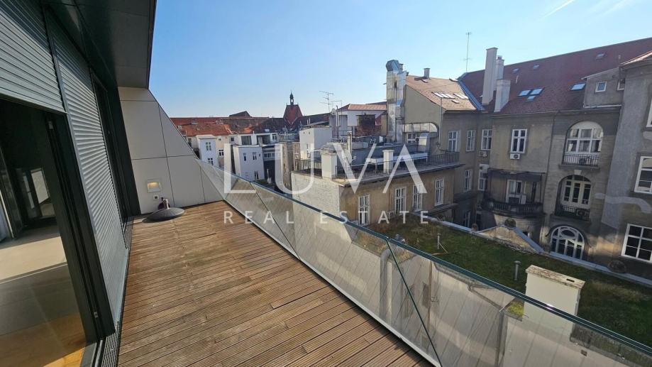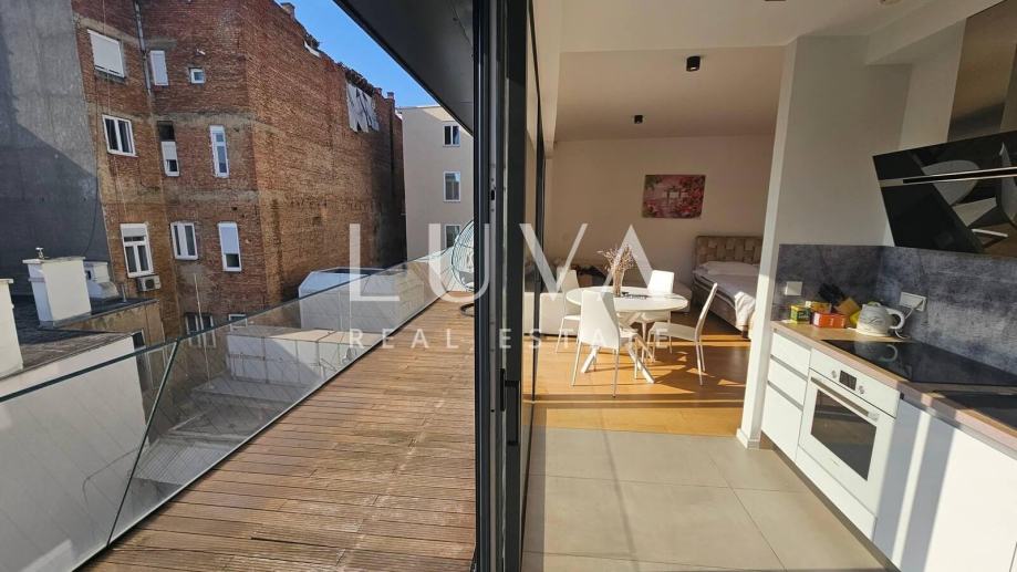 Prodaje se mali studio apartman od 38,23 m2 u jednoj od najluksuznijih zgrada u strogom centru Zagreba. Zgrada Ban centra je luksuzno uređena zgrada koja se sastoji od nekoliko ulaza te osigurava vrhunsku kvalitetu života u strogom centru Zagreba. Stan na prodaju je smješten na 5. katu, a sastoji se od ulaznog hodnika u kojem je smješten ugradbeni ormar, kupaonice i prostranog dnevnog boravka na koji se nastavlja kuhinja. Kroz cijelu kuhinju i dnevni boravak se protežu velike staklene stijene koje se mogu otvoriti, a kroz njih se izlazi na veliku terasu od 16m2 koja gleda na dvorišnu stranu. Stanu također pripada i garažno parking mjesto na -5 etaži.