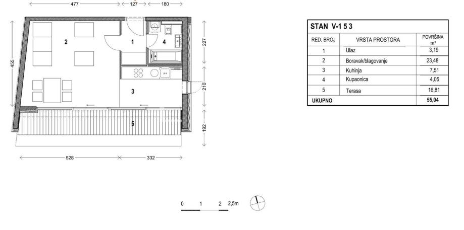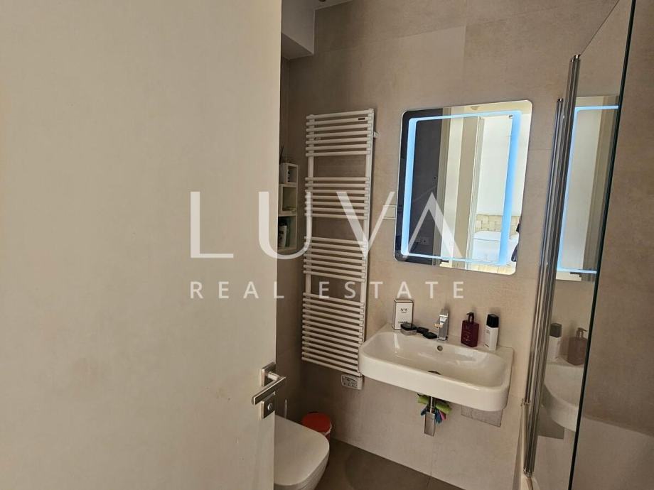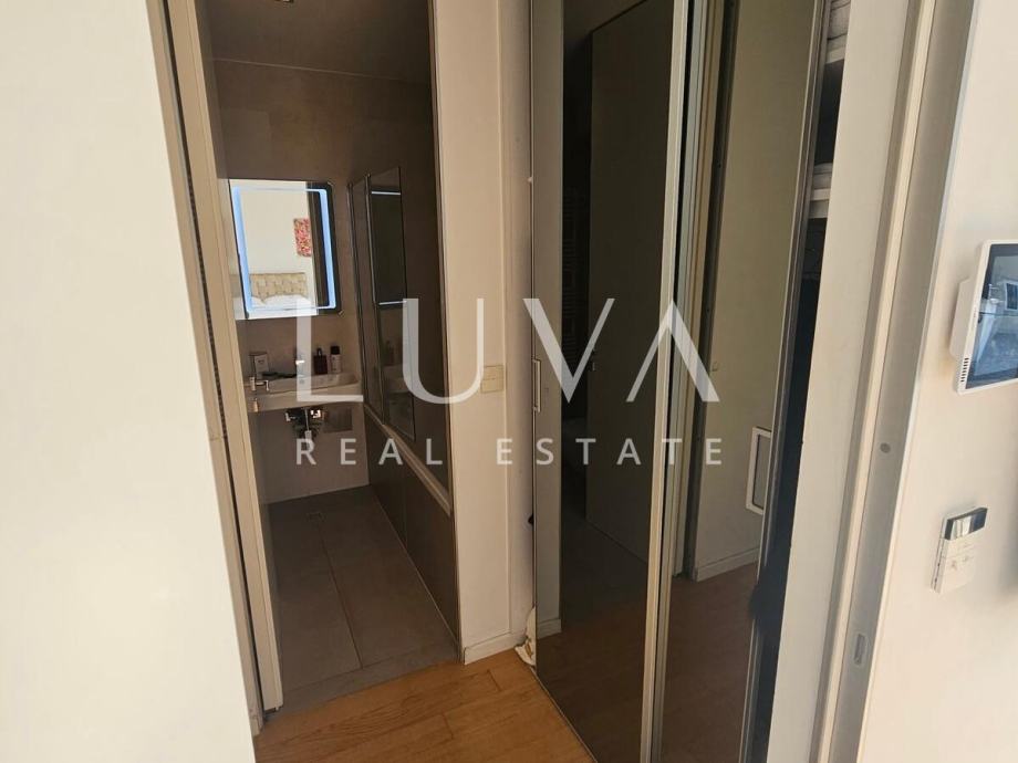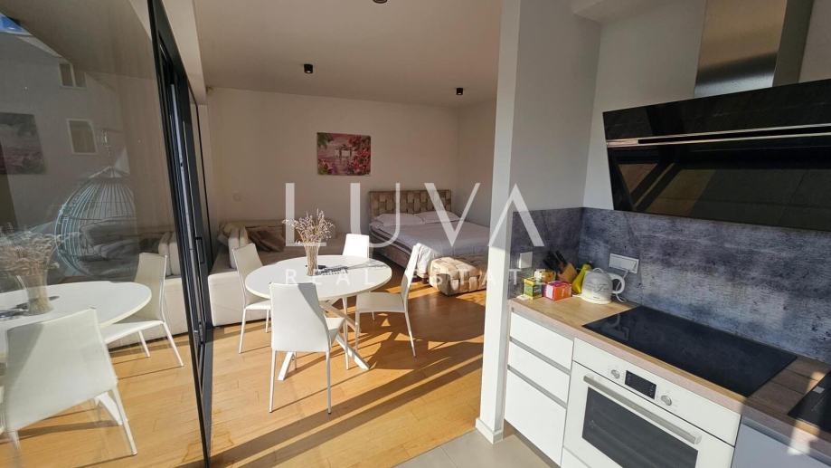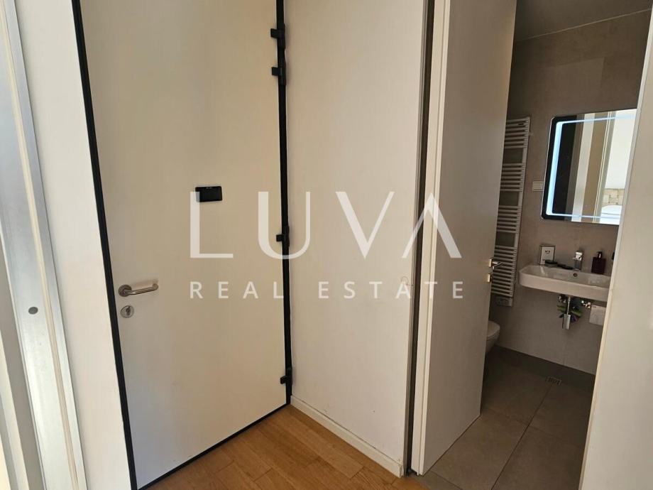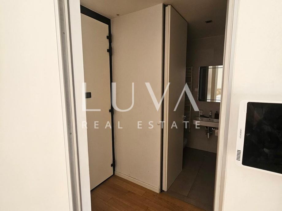 Prodaje se mali studio apartman od 38,23 m2 u jednoj od najluksuznijih zgrada u strogom centru Zagreba. Zgrada Ban centra je luksuzno uređena zgrada koja se sastoji od nekoliko ulaza te osigurava vrhunsku kvalitetu života u strogom centru Zagreba. Stan na prodaju je smješten na 5. katu, a sastoji se od ulaznog hodnika u kojem je smješten ugradbeni ormar, kupaonice i prostranog dnevnog boravka na koji se nastavlja kuhinja. Kroz cijelu kuhinju i dnevni boravak se protežu velike staklene stijene koje se mogu otvoriti, a kroz njih se izlazi na veliku terasu od 16m2 koja gleda na dvorišnu stranu. Stanu također pripada i garažno parking mjesto na -5 etaži.