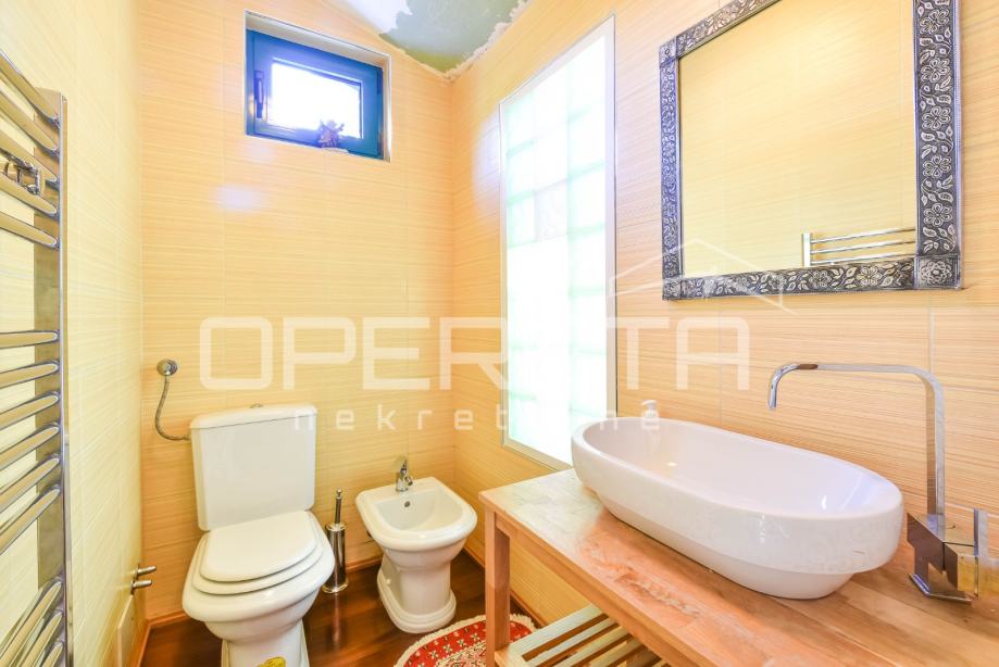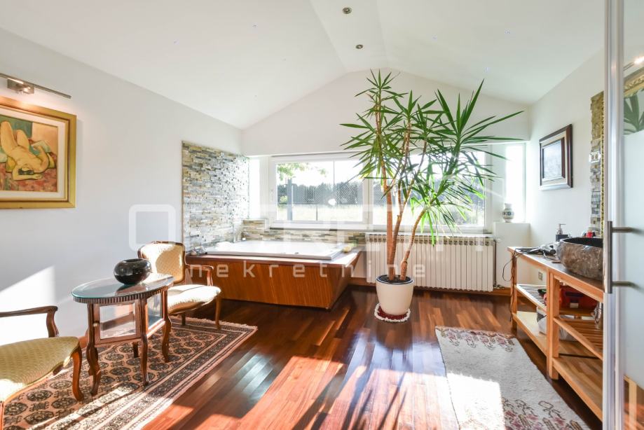 Desnim krilom prostire se "open space" dnevni boravak s blagovaonicom (113 m2) i izlazom na terasu, kuhinja, master spavaća soba s pripadajućom kupaonicom, 2 spavaće sobe, 2 radne sobe, zaseban wc, konoba, tehnička prostorija i dr..