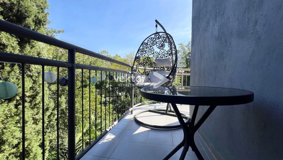 Stan je okružen zelenilom, a dva balkona pružaju privatnost i mir, dok brojni prozori osiguravaju obilje dnevne svjetlosti i sunca.