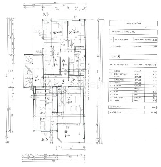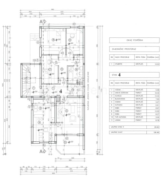 Stan br. 4 na 2. katu zgrade sastoji se od hodnika, dnevnog boravka, kuhinja, blagovaonica, kupaonica, 3 spavaće sobe, te lođe sa prekrasnim pogledom na more.