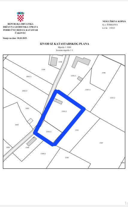 Nekretnina je smještena na građevinskom zemljištu ukupne površine 2500 m², koje je podijeljeno na dvije čestice.
