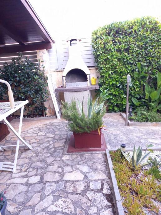Posebna vrijednost ovog apartmana je velika terasa koja služi kao produžetak interijera. Popločana kamenom, s natkrivenim dijelom, tendom, vanjskim tušem, stolom s klupama i zelenilom – pruža savršeno okruženje za jutarnju kavu, ručak u hladu ili večernja druženja. Zasađena maslina, grmolika živica i cvijeće stvaraju dojam male privatne oaze.