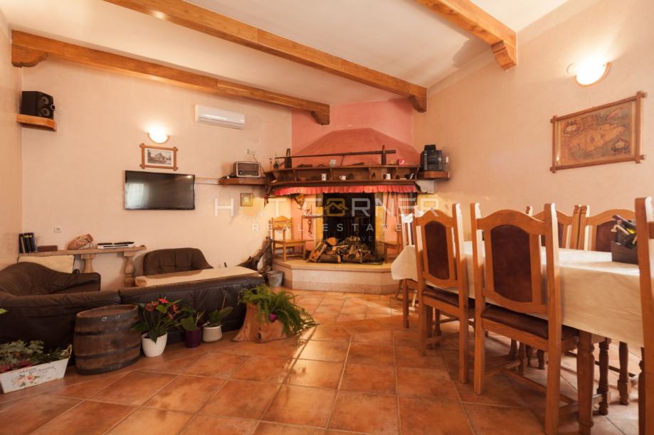 - u prizemlju kuće se smjestila stmbena jedinica sljedećeg rasporeda : ulazni hodnik, kuhinja, dnevni sa blagovaonom i kaminom koji može poslužiti i kao konoba, wc, kupaonica sa vešerajem, soba/radna soba, terasa te prostrana okućnica na kojoj je hidromasažni bazen od 50m2 sa dječjim djelom, roštilj, dječje igralište, vanjski tuš, ogromna hala od koje se može napraviti predivni i prostrani wellness i SPA zona.