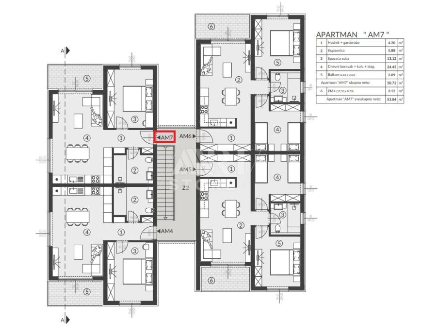 Stan AM7 se nalazi na prvom katu, ima jednu spavaću sobu, kupaonu te dnevni boravak sa kuhinjom te balkonom od 6,18 m2.