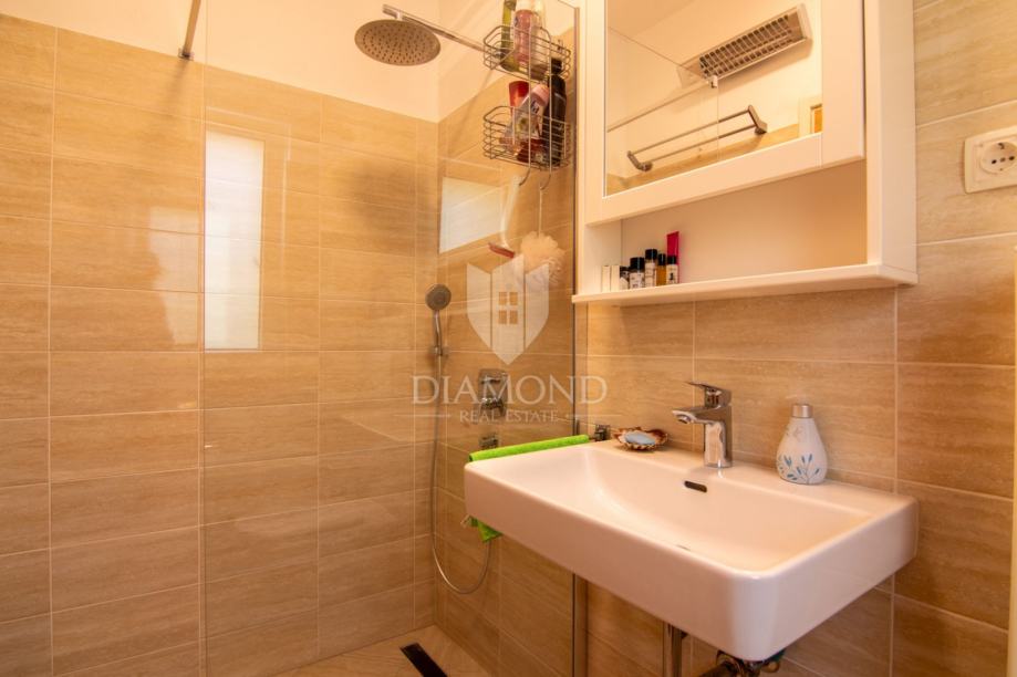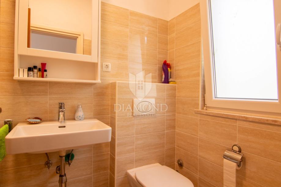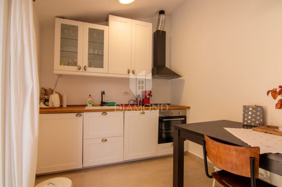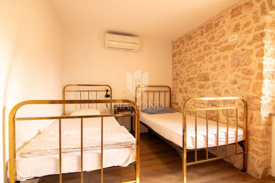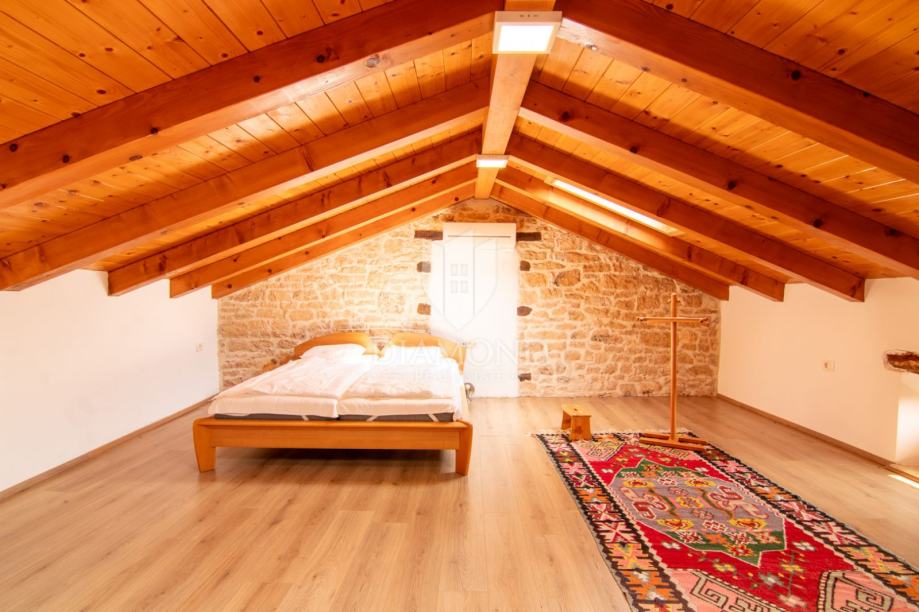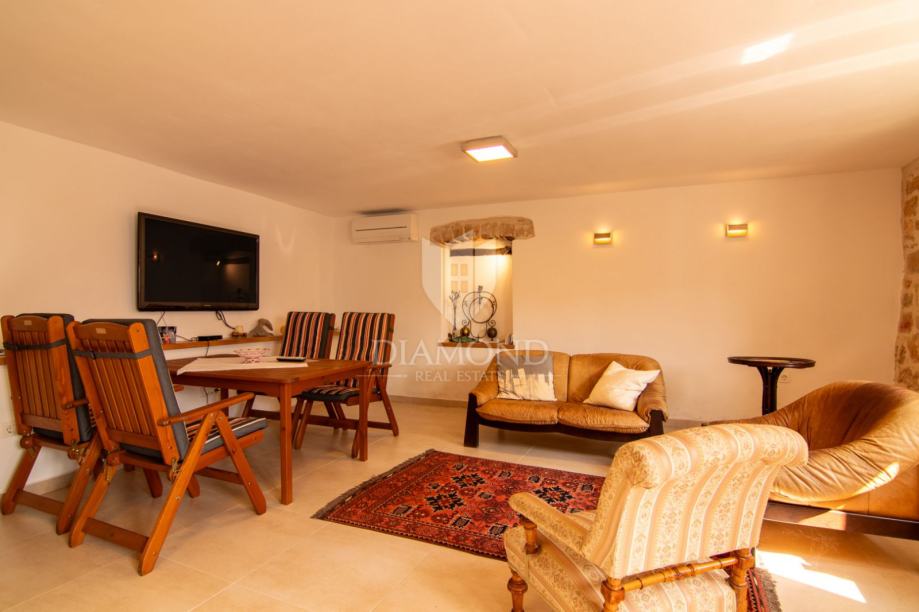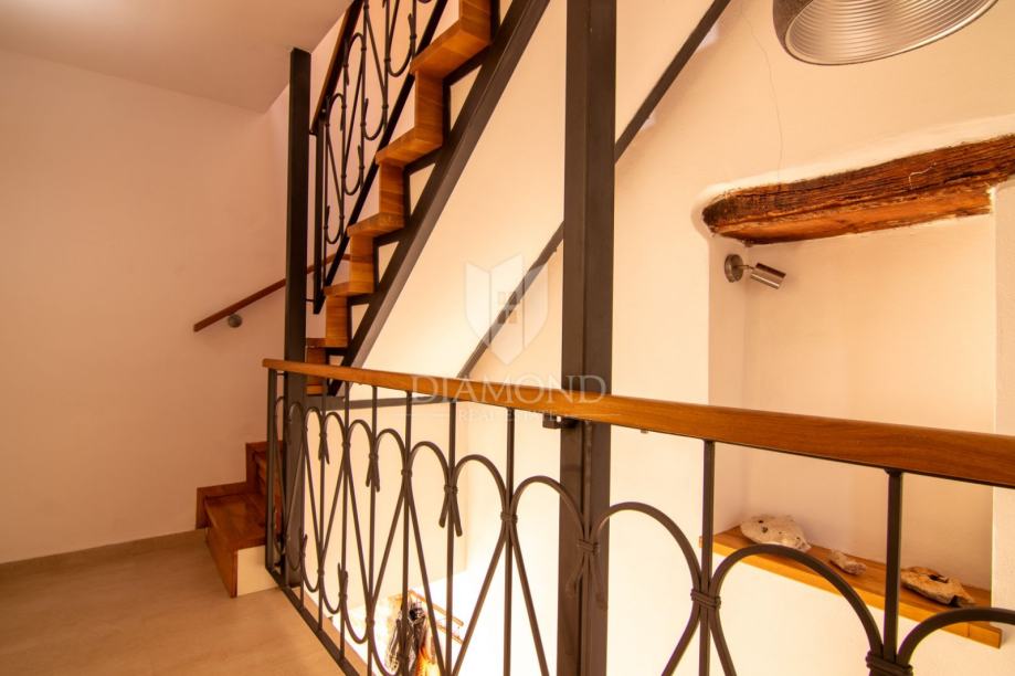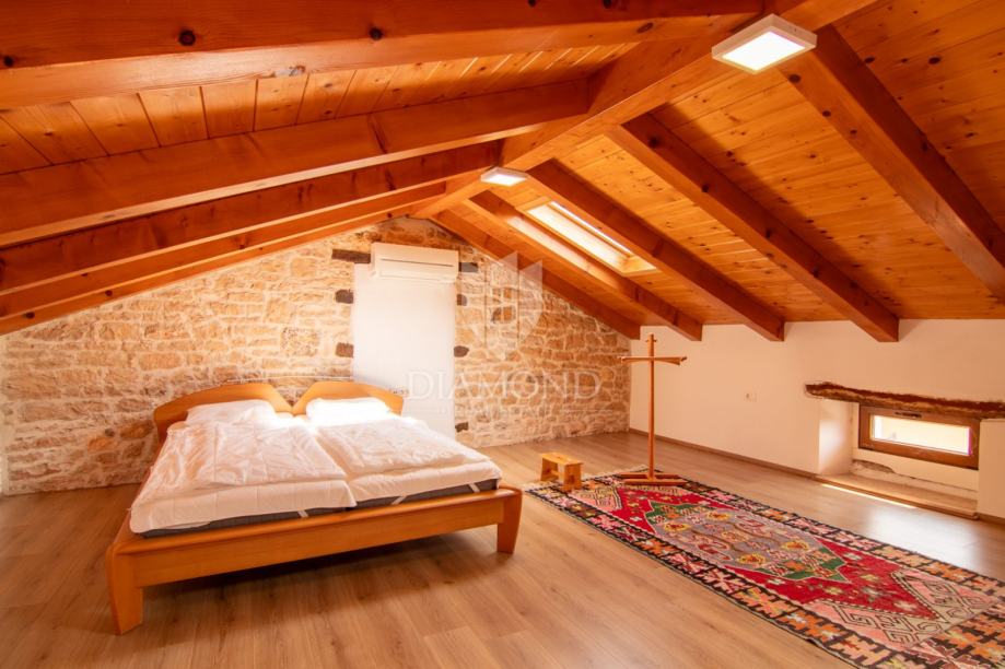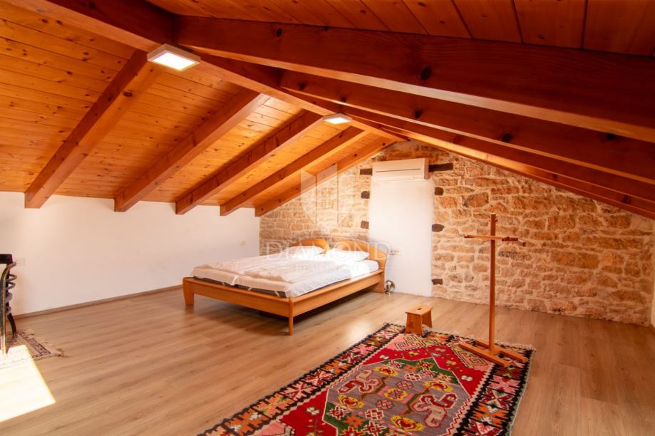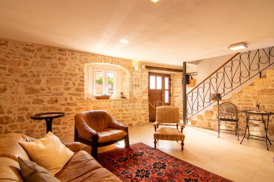 Kuća se prostire na više etaža i nudi tri udobne spavaće sobe, idealne za obitelj ili smještaj gostiju, moderno opremljenu kupaonicu, dodatni toalet te funkcionalnu kuhinju koja zadržava istarski karakter, ali zadovoljava sve suvremene potrebe. Poseban dojam ostavlja prostrani dnevni boravak, koji svojim toplim ambijentom, detaljima od prirodnog drva i izloženim kamenim zidovima odiše rustikalnom elegancijom i autentičnom atmosferom.