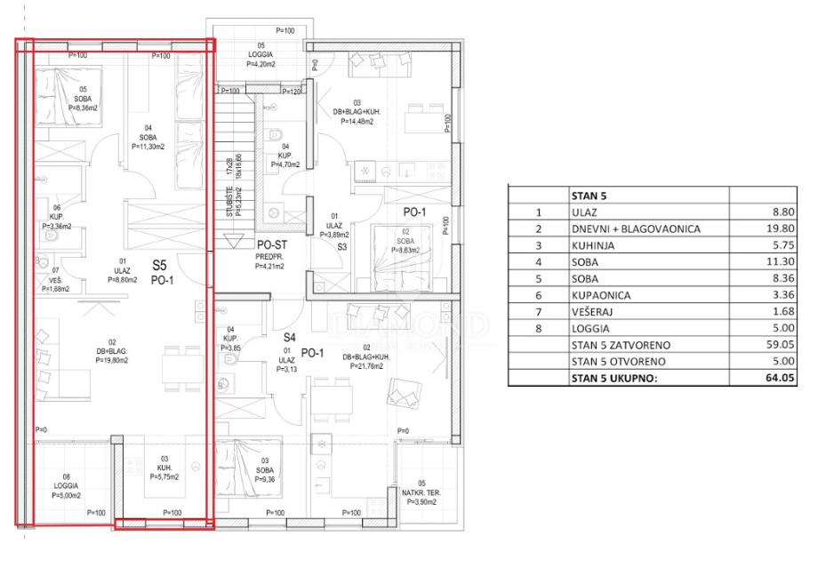 Nadomak samoga centra ovog živopisnog mjesta, u izgradnji je stambena zgrada koja se proteže kroz prizemlje i kat. Predmet prodaje je stan na katu ukupne površine 64.05 m2 koji objedinjuje dvije spavaće sobe, kupaonicu, praonicu te kuhinju sa blagovaonicom i dnevni boravak sa loggiom.