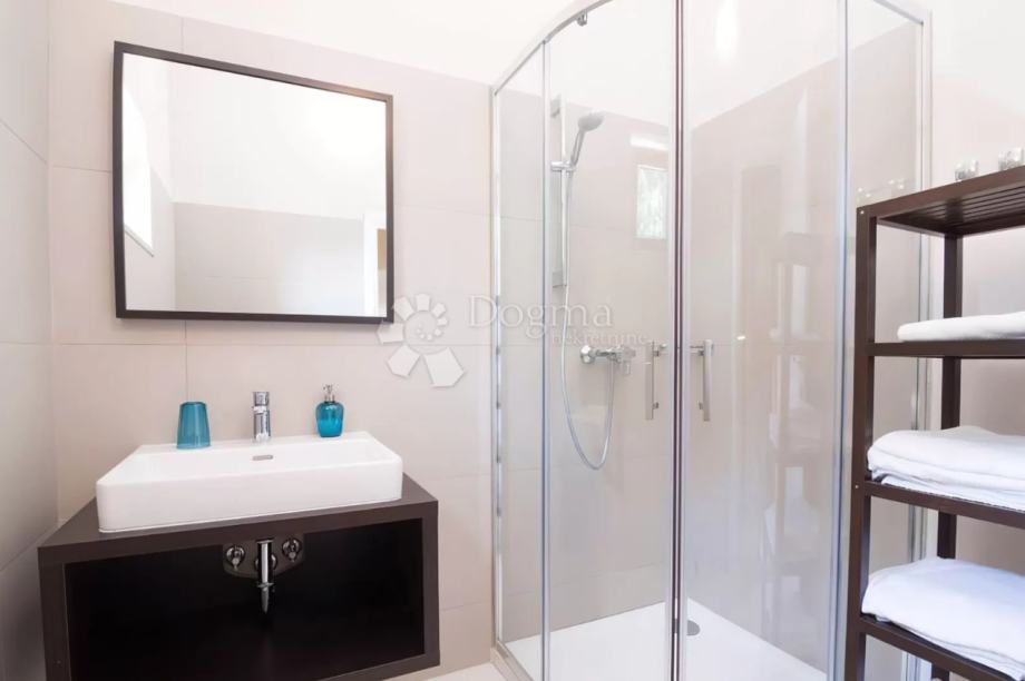 Vanjski dio nekretnine posebno oduševljava. Prostrana terasa idealna je za opuštanje na otvorenom, a tu se nalaze bazen površine 24 m² sa sunčalištem te vanjski kamin, savršen za druženja tijekom toplih istarskih večeri.