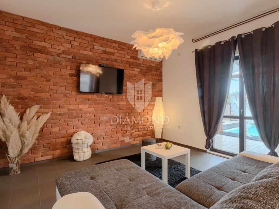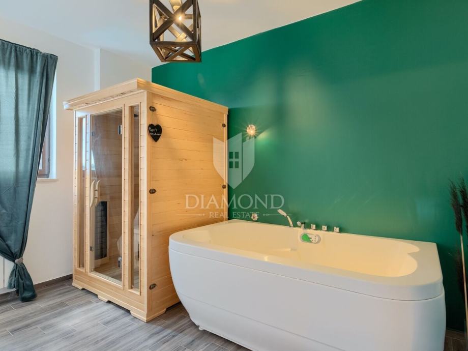 Kuća se sastoji od podruma, prizemlja i kata ukupne površine 250 m2. Na katu se nalaze tri spavaće sobe, dvije kupaonice, wellness zona sa hidromasažnom kadom i saunom te soba za biljar. Iz prostorije za wellness izlazimo na prostranu natkrivenu terasu gdje se nalazi jacuzzi kada i lounge dio sa prekrasnim pogledom na okolni krajolik i dijelić mora. Prizemlje obuhvaća komforan dnevni boravak, potpuno opremljenu kuhinju i blagovaonicu. Tu se nalaze i tri spavaće sobe, tri kupaonice i gostinjski toalet. Pitanje grijanja i hlađenja riješeno je klima uređajima i centralnim grijanjem na pelete. Podrum trenutno služi kao skladišni prostor a tu se nalazi i strojarnica bazena te kotlovnica.