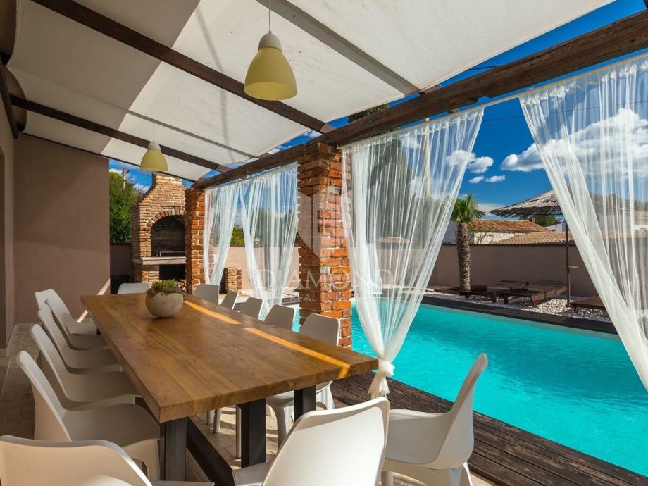 Okućnica je ograđena i uređena sa osiguranim parkingom i garažom. Bazen od 32 m2 sa uređenim sunčalištem svakako je glavno mjesto druženja tijekom ljetnih mjeseci a koncept okućnice nudi potpunu privatnost što garantira savršeni odmor i bijeg od užurbanog gradskog života. Tu se nalazi i lijepa natkrivena terasa sa zidanim kaminom i stolom za blagovanje. Kuća je na novo renovirana 2018. godine te je od tada i u turističkom najmu što vlasnicima osigurava odlične prihode svake godine.