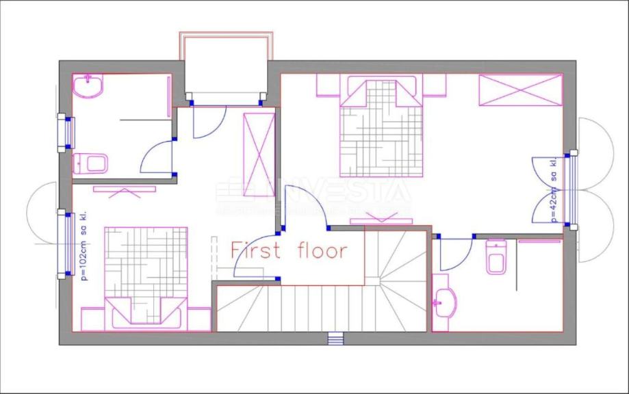 Prvi kat se sastoji od dvije prostrane spavaće sobe od kojih svaka ima pristup svojoj kupaoni i jedne terase.