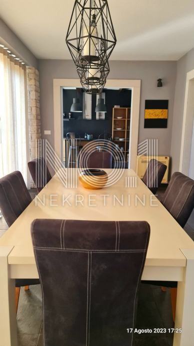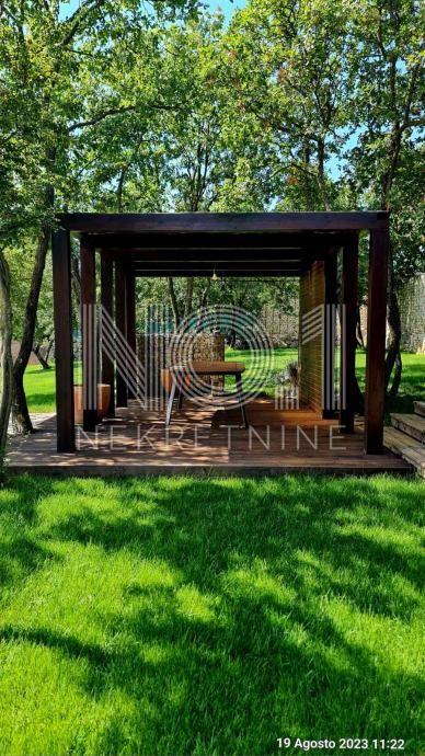 Iz dnevnog boravka i blagovaonice izlazi se na prostranu terasu koja vodi do prelijepog vrta, gdje se nalazi bazen od 32 m2, i podest za uživanje s mogućnošću ugradnje roštilja.