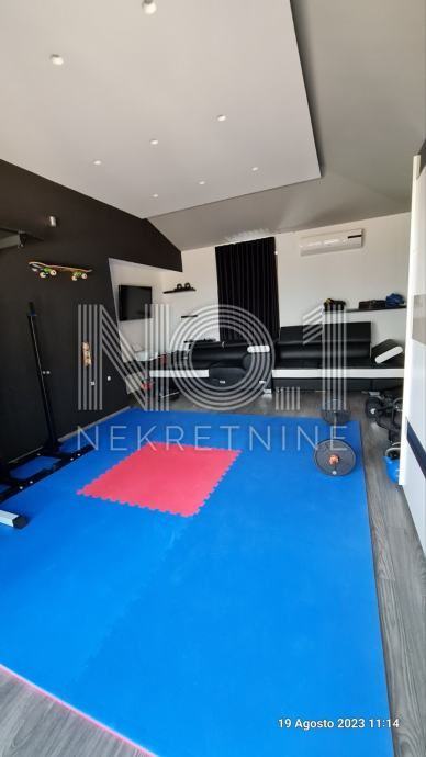 Na prizemlju se smjestio ulazni hodnik, kupaonica/toalet za goste, prostrani dnevni boravak s kaminom, kuhinja i blagovaona otvorenog tipa s izlazom na terasu. Također, tu se nalazi i odvojena prostorija koja je namijenjena kao teretana.