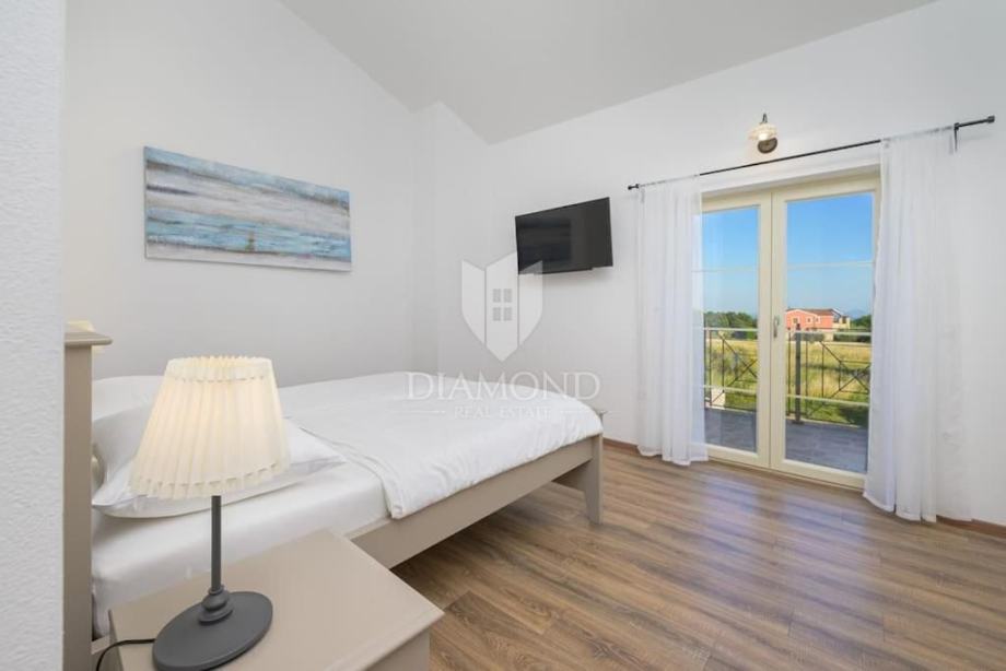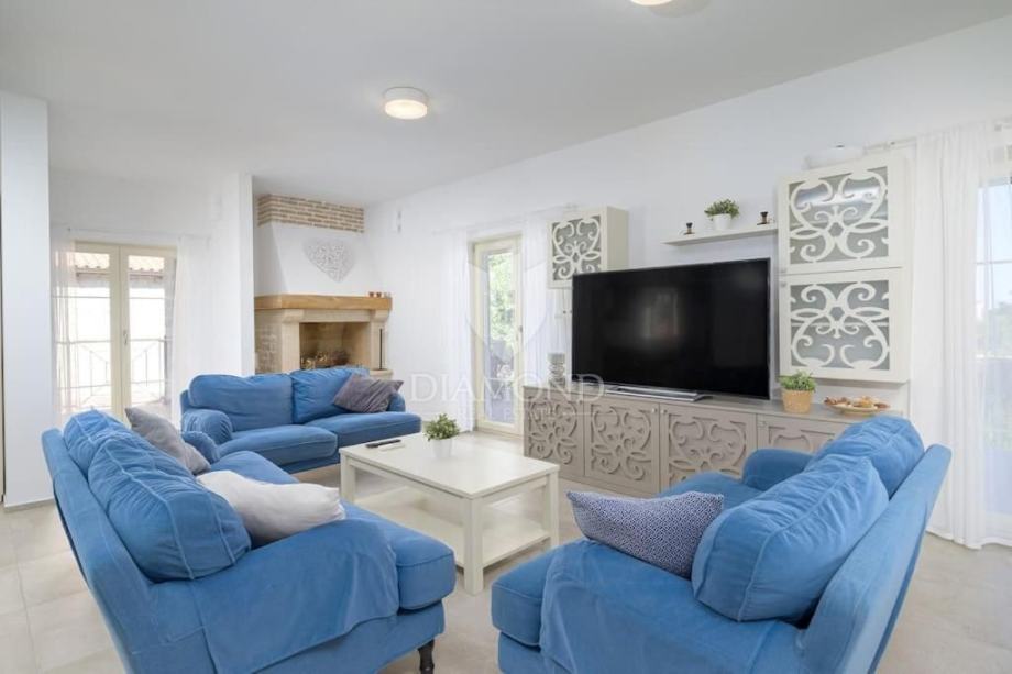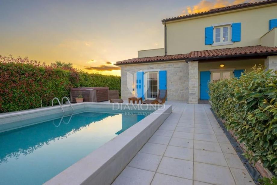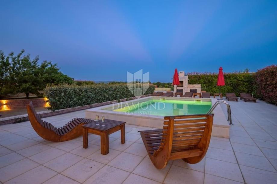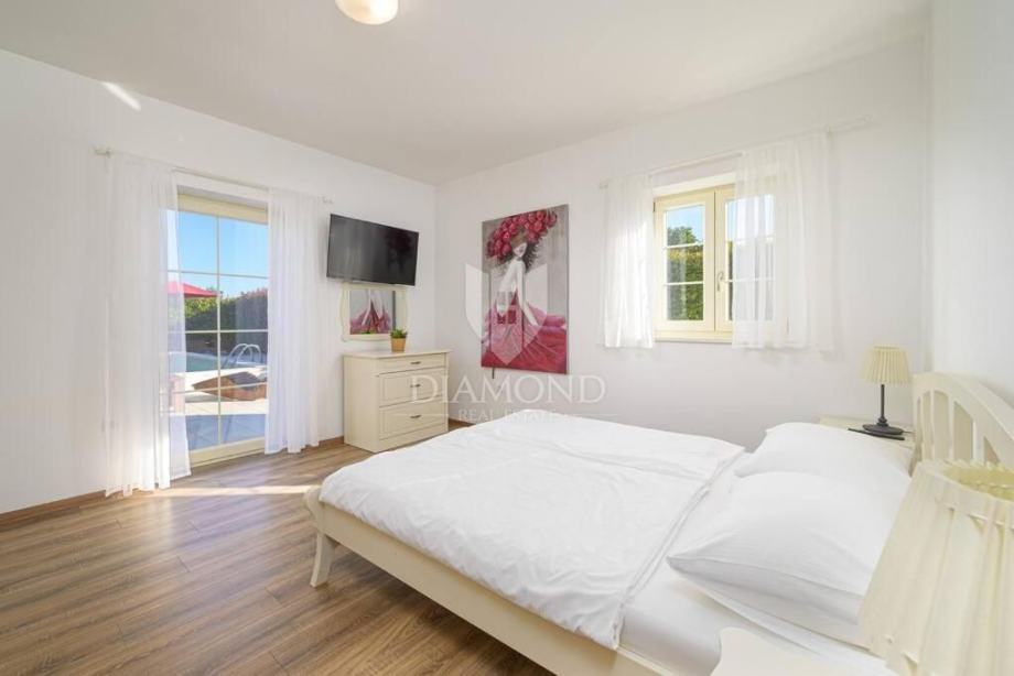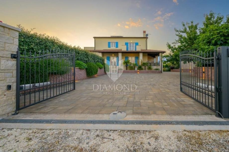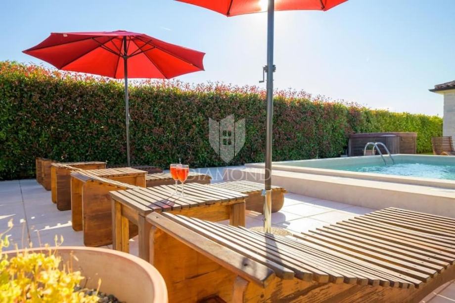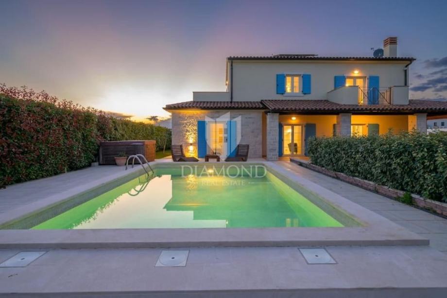 Ova elegantna vila s bazenom, saunom i jacuzzijem, smještena je u mirnom i slikovitom mjestu nedaleko od Barbana, na izvrsnoj lokaciji koja nudi savršenu privatnost. Udaljena je samo 2 km od mora, s kojeg se pruža očaravajući pogled koji obuhvaća cijelo imanje.