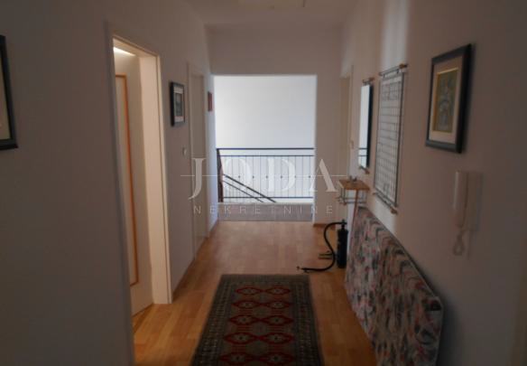 Na prvom katu nalazi se stambeni prostor površine 88m2 trenutno uređen kao ulazni hodnik, kupaonica, dodatni wc, spavaća soba te otvoreni prostor kuhinje s blagovaonom i dnevnim boravkom. Ova etaža ima veliku nenatkrivenu terasu površine 98m2.