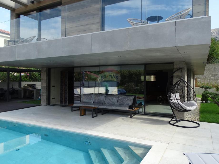 Baška - prodajemo ekskluzivnu kuću površine 240 m2 na lokaciji 500m od mora. Kuća se sastoji od prizemlja u kojem je kuhinja s dnevnim boravkom i toalet, te na katu se nalazi četiri spavaće sobe, svaka soba ima svoje kupatilo, te terasa. Vrhunska kvaliteta i moderna gradnja. U suterenu je sauna, jacuzzi, igraonica, vešeraj i kotlovnica. Kuća ima podno grijanje i hlađenje. Proizvodi struju preko solarnih panela. Bazen koji se grije i hladi brutto površine 40m2. Parking ispred kuće. Također se prodaje još jedna ista kuća pored ove, po istoj cijeni od 2.000.000,00€. Agent je u Baški.