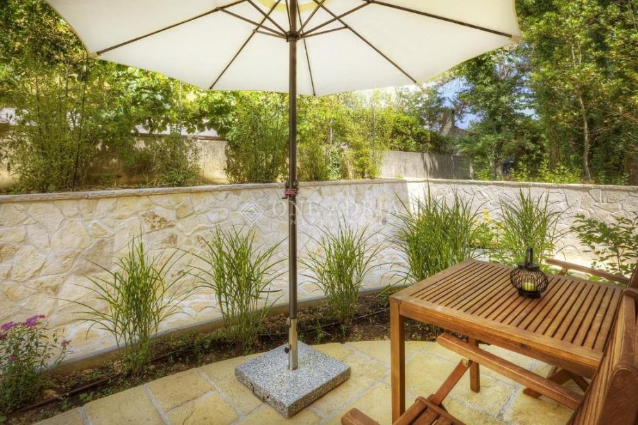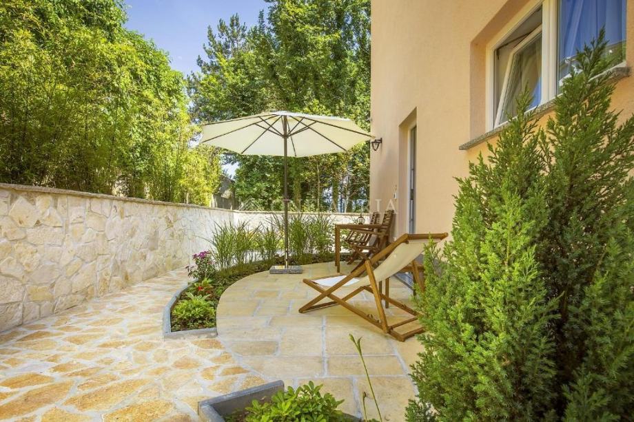 U vanjskom dijelu vile nalazi se prostrano sunčalište s ležaljkama i suncobranima te bazen koji pruža potpunu privatnost i ugodu, stvarajući doživljaj mediteranske oaze. Uz bazen se nalazi prostor za druženje i roštilj, idealan za obiteljska i prijateljska okupljanja. Na okućnici je osiguran veliki parking s video nadzorom i priključkom za električna vozila.