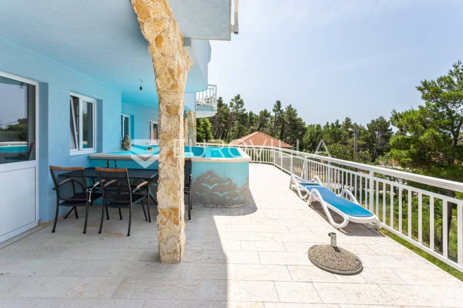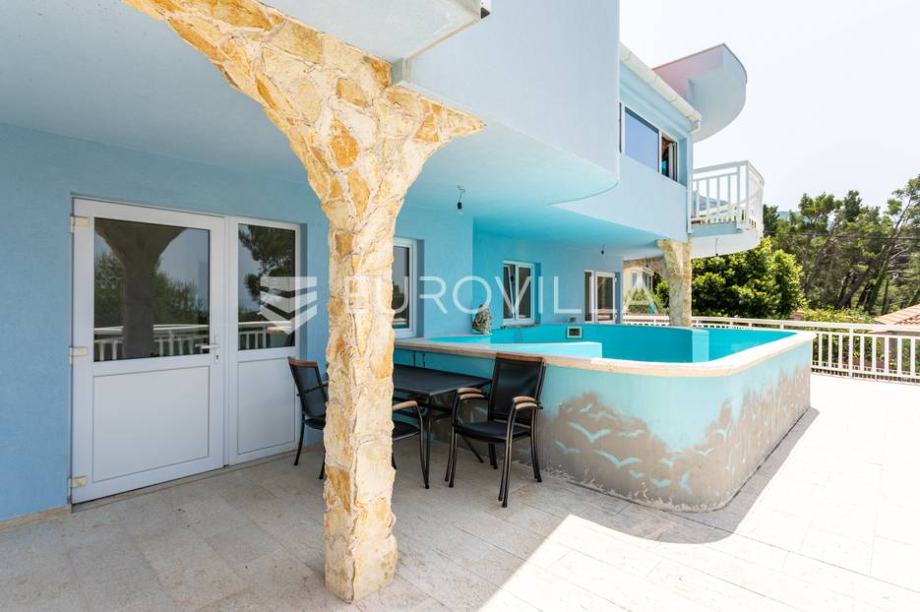 Kuća u tradicionalnom Dalmatinskom štihu na tri etaže s bazenom i garažom, te panoramskim pogledom na more. Kuća s bazenom nalazi se na parceli veličine 580 m2. Izvrsno je prometno povezana te ima pristupni put širine 5 m. Pripadaju joj podrum sa svim instalacijama i garaža za tri...