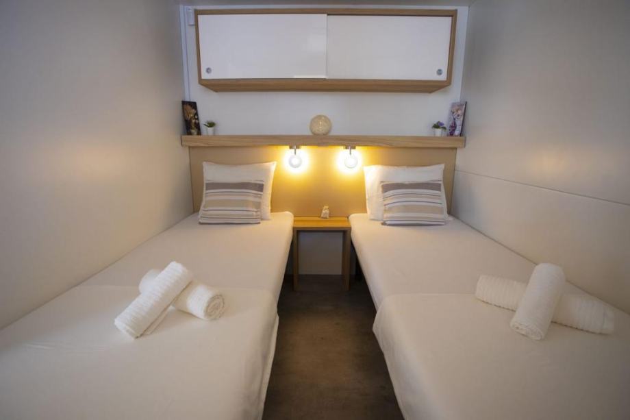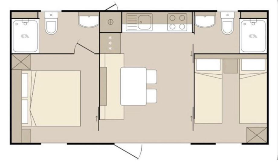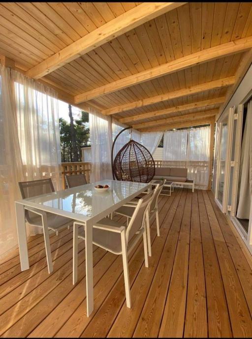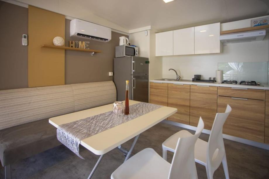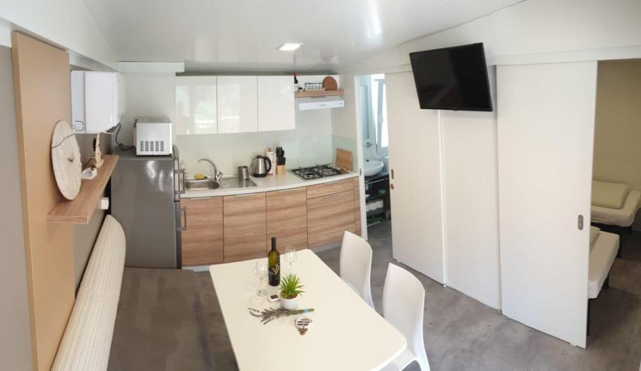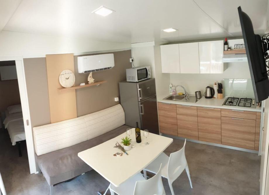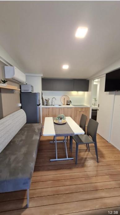 Elektricni bojler, keramička ploca, perilica suđa, android tv, mikrovalna pećnica,kuhalo za vodu, hladnjak, toster-roštilj, kompletno posuđe, štapni usisavac, parna pegla….. Godšnja cijena zakupa zemljista koji ukljucuje struju, vodu, odvodnju, koristenje terena, parking, za vrijeme rada kampa 24h recepcija iznosi cca4200€/godišnje. Udaljenost od plaze 200 metara.Za kupnju dvije kuce dajem popust. Ciscenje objekta imamo dogovoreno kao i spremiste za posteljinu.