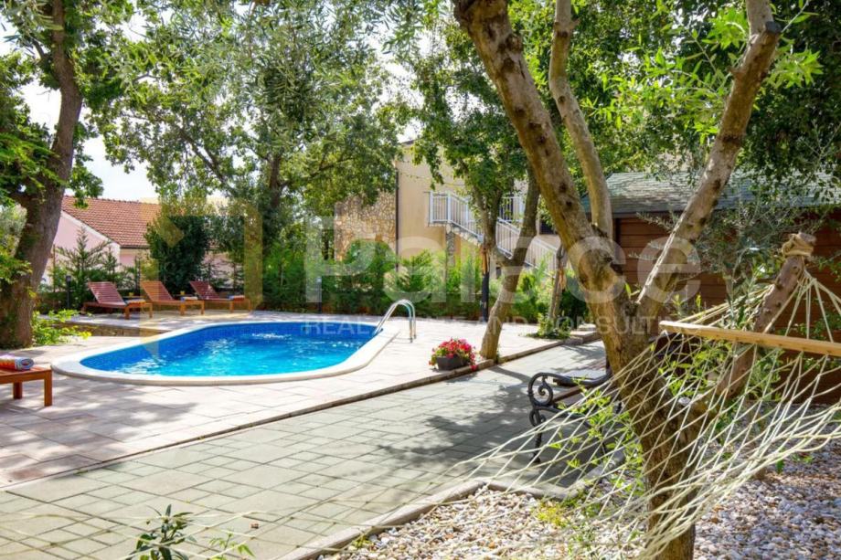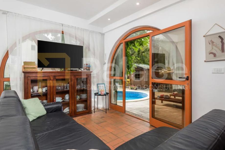 Vanjski prostor kuće nudi oazu mira s bazenom i manjom kućicom opremljenom kuhinjom i hladnjacima, idealnu za pripremu ljetnih obroka.