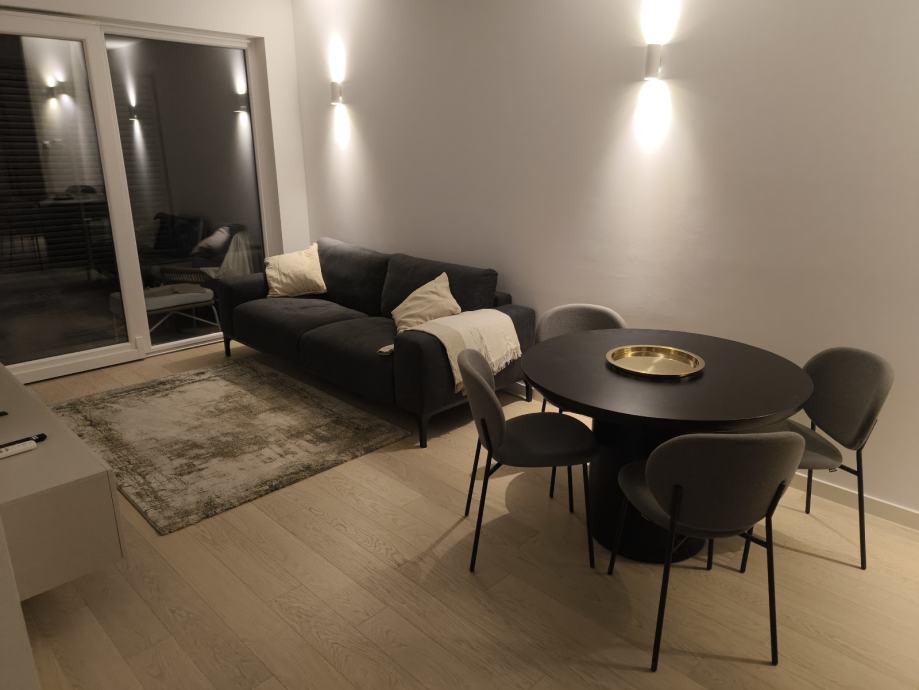 Iznajmljuje se jednosoban stan na 4.katu novogradnje Bel Etage 2, veličine 60m2 i jedno parkirno mjestu u podzemnoj garaži od 12.5 m2 (d5xš2.5m). Stan je kompletno južne orijentacije sa otvorenim pogledom na more i otoke. Stan se sastoji od ulaznog hodnika, kuhinje, otvorene blagovaonice sa dnevnim boravkom, kupaone, sobe i lođe. Stan je klimatiziran (kuhinja/dnevni boravak i spavaonica) i podno grijanje u kupaonici. Stanari imaju pravo korištenja teretane i usluge recepcije bez dodatnih troškova. Stan je namješten za praktičan život sa dovoljno garderobnog prostora (nije koncipiran kao apartman).