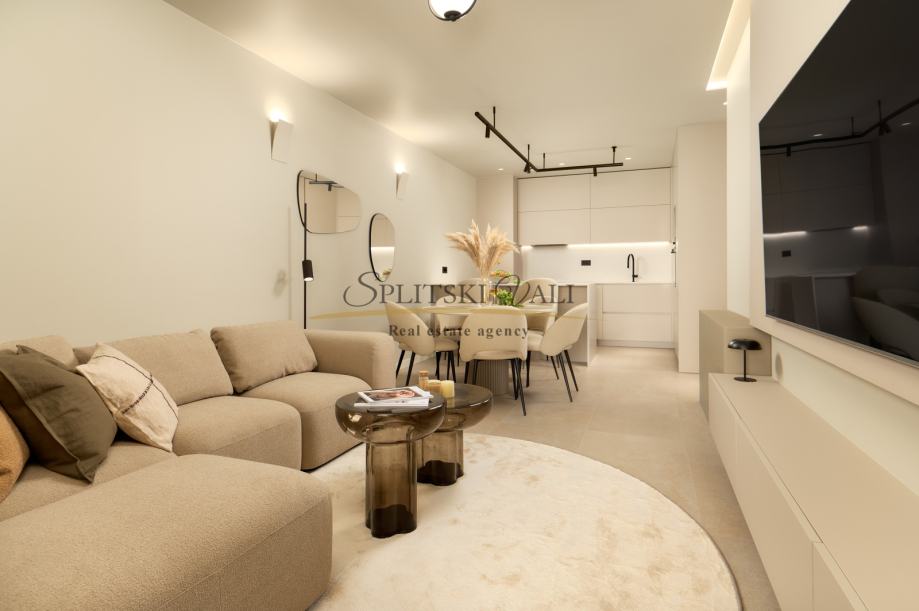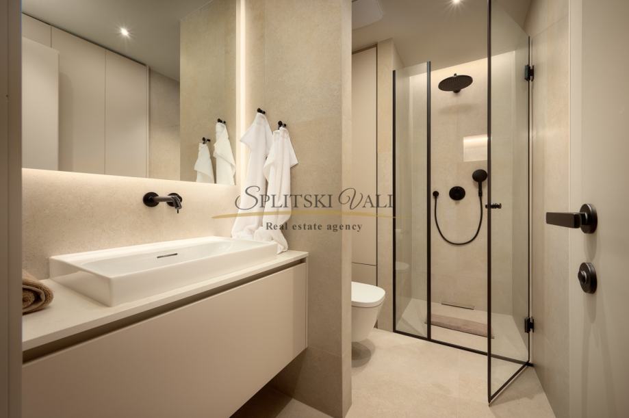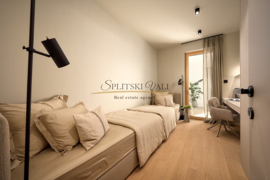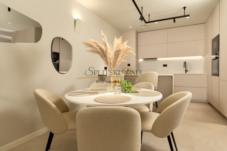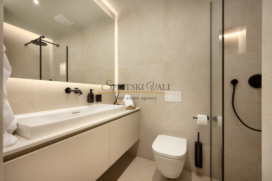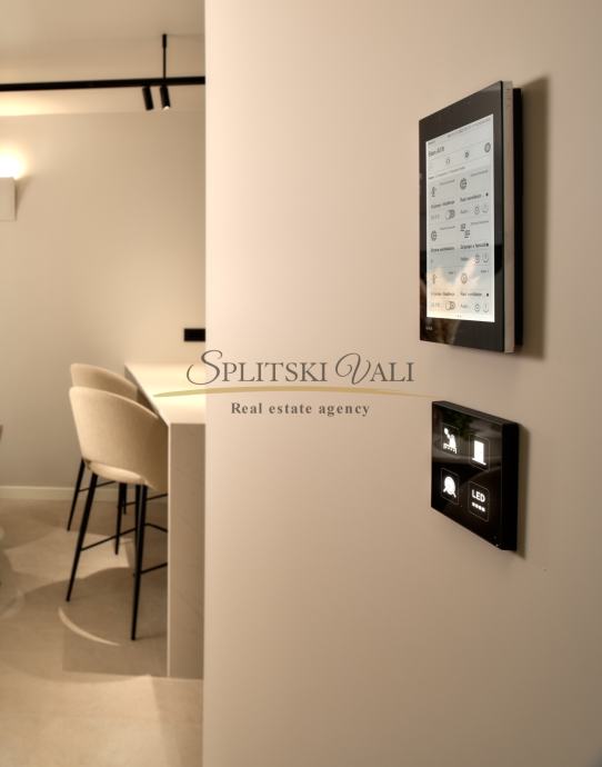 U potpunosti je opremljen namještajem vrhunske kvalitete te mu pripadaju čak dva garažna parking mjesta te sprema.