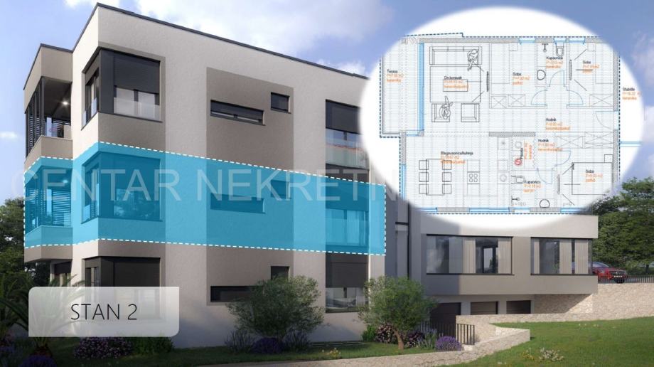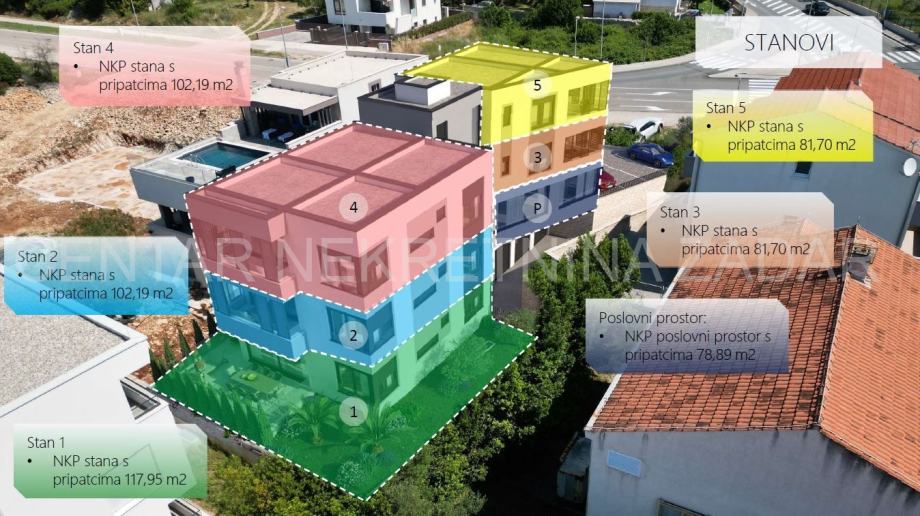 S1 - prizemlje, trosoban stan, 117,95 m² - 399.000,00 € S2 - 1. kat, trosoban stan 102,19 m² - 385.000,00 € S3 - 1. kat, dvosoban stan 81,70 m² - 295.000,00 € S4 - 2. kat, trosoban stan 102,19 m² - 385.000,00 € S5 - 2. kat, dvosoban stan 81,70 m² - 295.000,00 € PP1 - poslovni prostor od 78,89 m² - 320.000,00 €