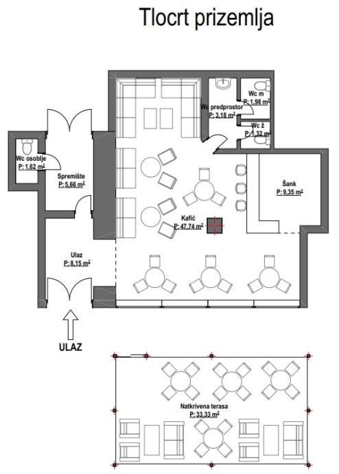 Poslovni prostor nalazi se u prizemlju višestambene zgrade te se dugi niz godina koristi kao ugostiteljski objekt. Tlocrtni raspored sastoji se od ulaza, prostora (kafića) u kojem se nalaze separei i stolovi, šanka, spremišta i 3 wc-a (ženski, muški, osoblje). Tlocrtni raspored nalazi se u fotografijama.