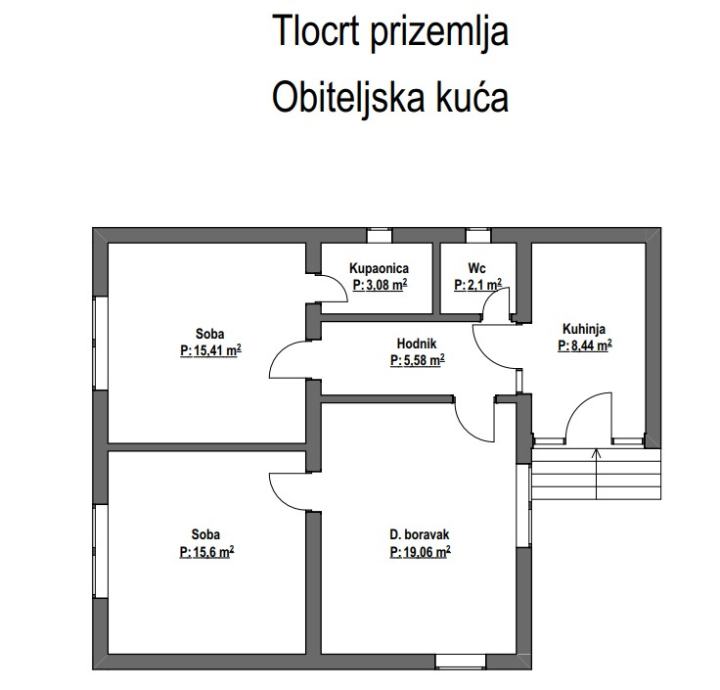 Prizemlje obiteljske kuće sastoji se od kuhinje, hodnika, dnevnog boravka, 2 spavaće sobe i adaptirane kupaonice i wc-a, ukupne korisne površine 69,27 m2. Tlocrt prizemlja nalazi se u fotografijama. Grijanje kuće je centralno na plin pomoću kombi bojlera i radijatora. Kuća je uredno održavana i u vrlo dobrom stanju. Kuća je građena prije 1968. godine te posjeduje urednu dokumentaciju - uporabnu dozvolu i energetski certifikat razreda G.
