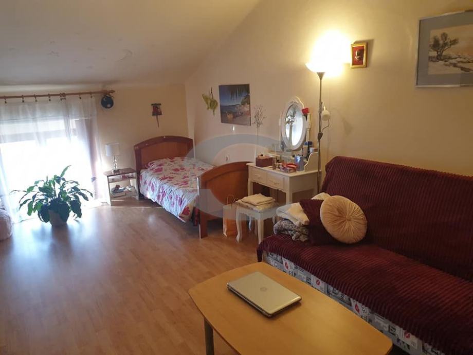Stan je smješten u visokom potkrovlju u urednoj stambenoj zgradi s obnovljenim krovom.