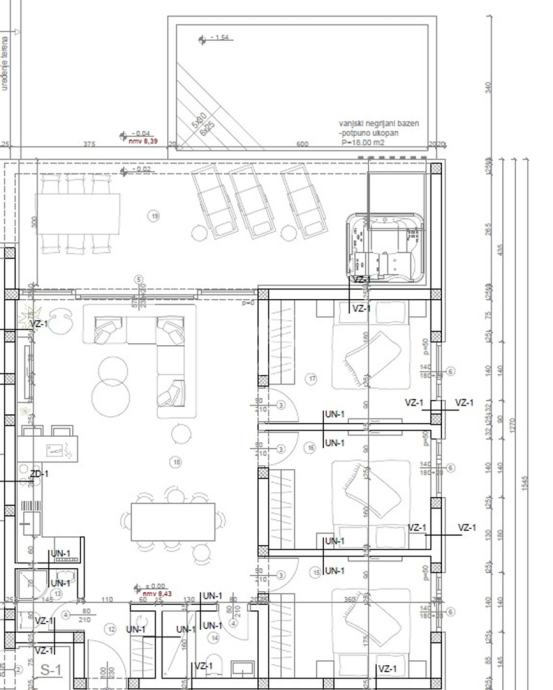 Stan oznake S2 u prizemlju, sastoji se od: OPEN SPACE koncepta kuhinje, blagavaone i dnevnog boravka, garderobe, 3 spavaće sobe, 2 kupaone, lođa + bazen 18 m2