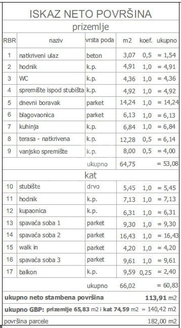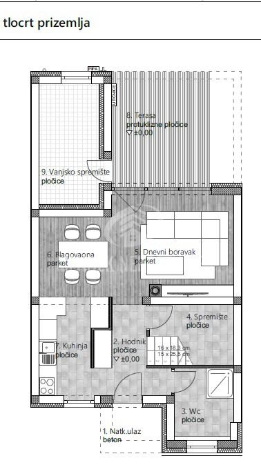 - Prizemlje: natkriveni ulaz, hodnik, wc, unutarnje spremište, kuhinja, blagovaonica, dnevni boravak, natkrivena terasa i vanjsko spremište.