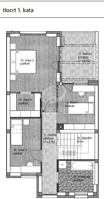 - Kat: hodnik, kupaonica s wc-om, tri spavaće sobe i balkon.
