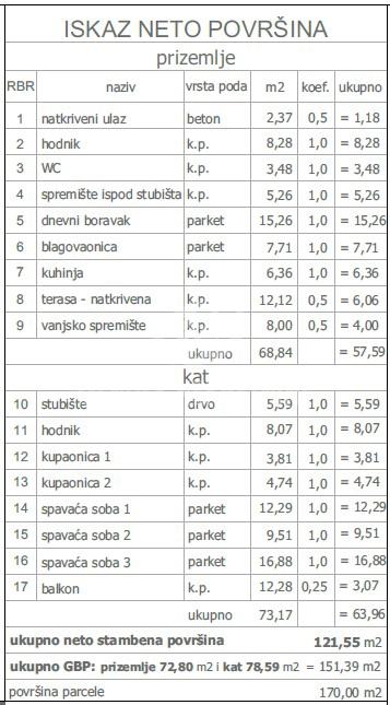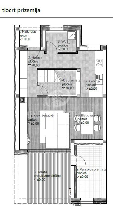 - Prizemlje: natkriveni ulaz, hodnik, wc, unutarnje spremište, kuhinja, blagovaonica, dnevni boravak, natkrivena terasa i vanjsko spremište.